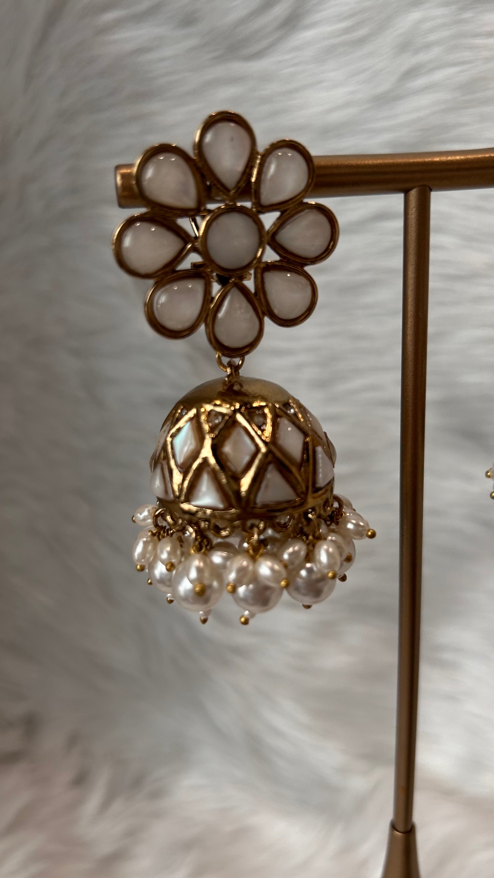 The Aanya Mother of Pearl Jhumkas bring together timeless charm and modern elegance. Featuring delicate floral motifs crafted with lustrous Mother of Pearl and finished with cascading pearls, these earrings radiate subtle sophistication — perfect for festive days or elegant evening wear.