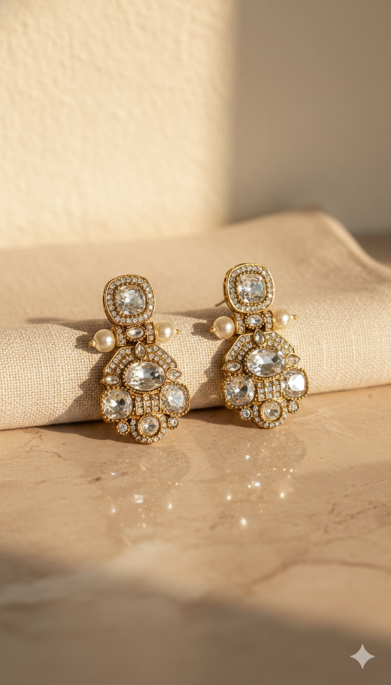 The Amara Festive Earrings feature a graceful layered design highlighted with kundan stones set in an antique gold finish. The structured silhouette is inspired by classic festive jewellery, making it a timeless choice for weddings, celebrations, and special occasions. Elegant yet statement-worthy, these earrings elevate both traditional and Indo-western looks effortlessly.