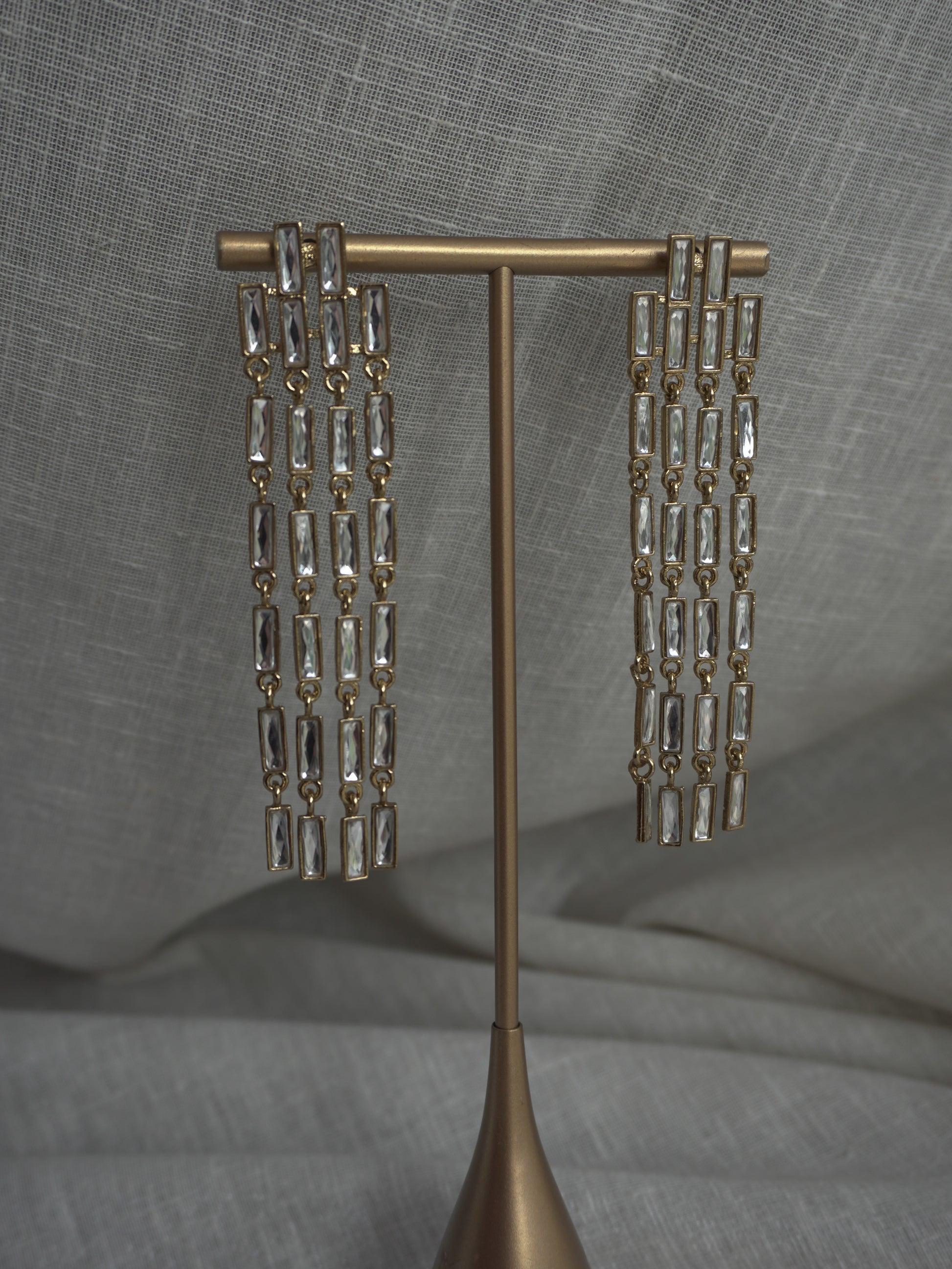 A sleek, modern take on festive glamour – these long cascade earrings feature rows of rectangular crystals set in gold-toned pewter, designed to sway with every step. Lightweight yet statement-making, they’re perfect for cocktail nights or wedding soirées.