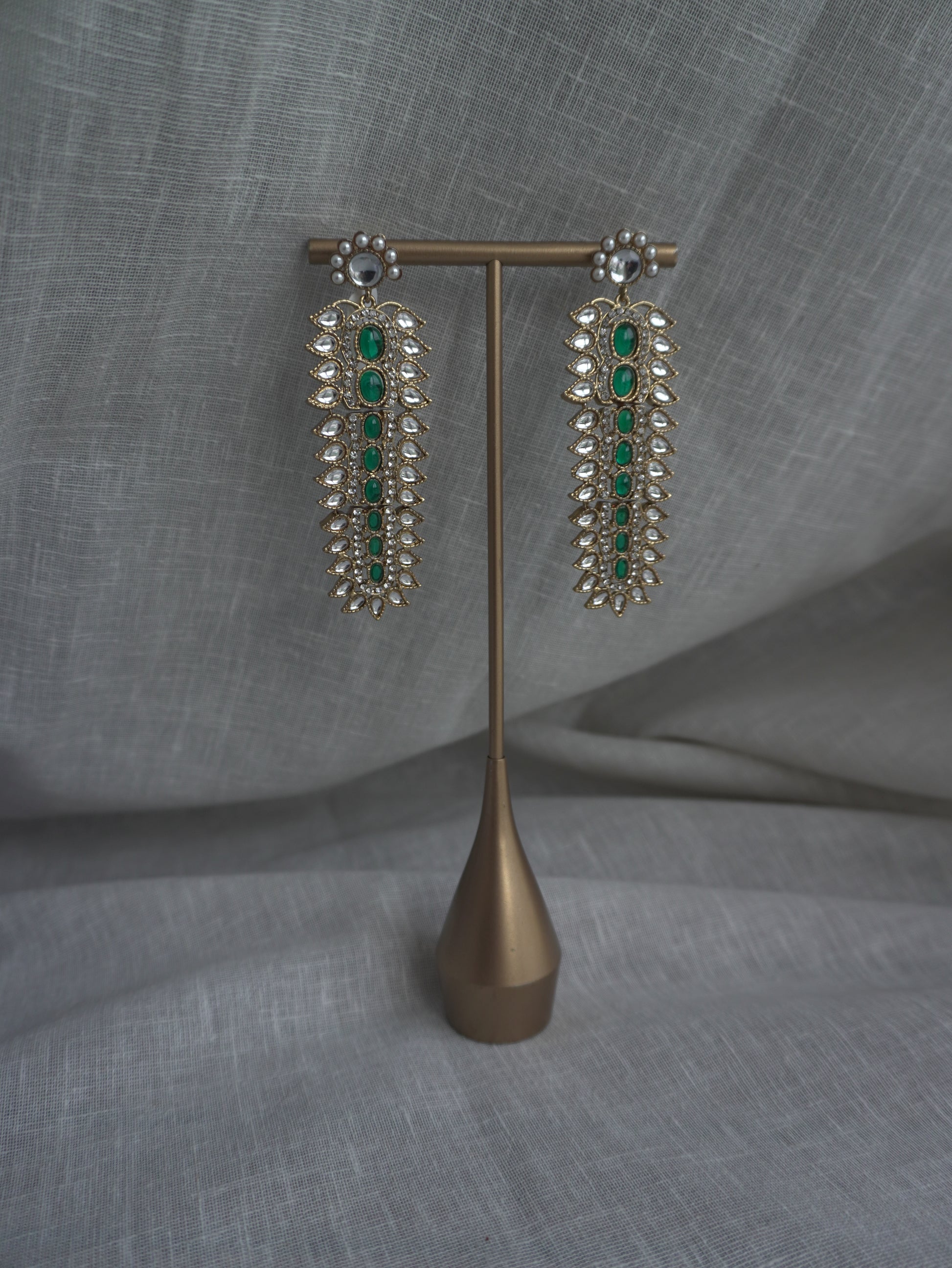 The Emerald Cascade Drops are designed to bring glamour in every sway. Embellished with emerald-toned stones and sparkling crystals, these long danglers are the epitome of festive drama. Perfect for wedding nights, cocktail looks, or whenever you want to make a grand impression.