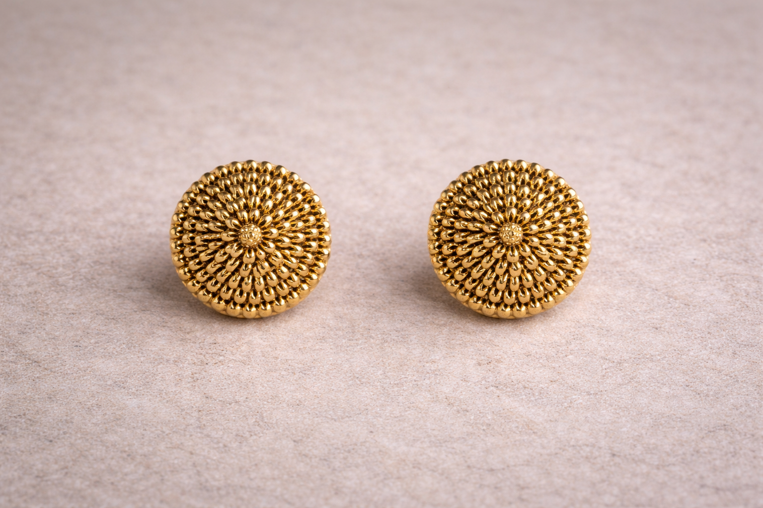 Classic dome studs featuring intricate radial texture that reflects light beautifully. The sculpted gold finish gives them a timeless look, making them perfect for everyday wear as well as understated festive styling.