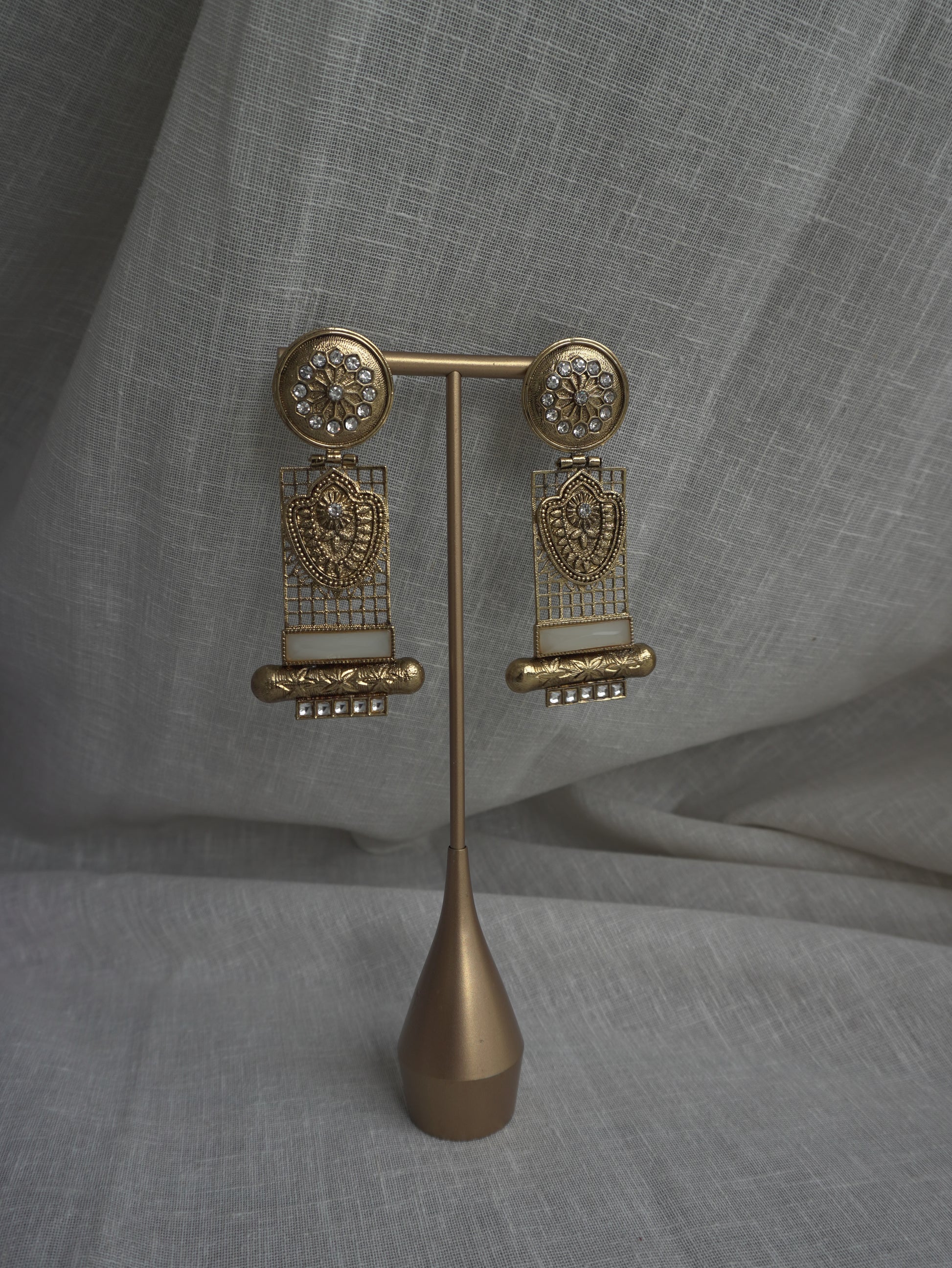 Step into bold elegance with our Gold Grid Drama Earrings. Featuring a fusion of vintage-inspired motifs, shimmering stones, and geometric grid work, these earrings are made to stand out. Lightweight yet striking, they bring the perfect balance of drama and charm for festive nights and statement styling.