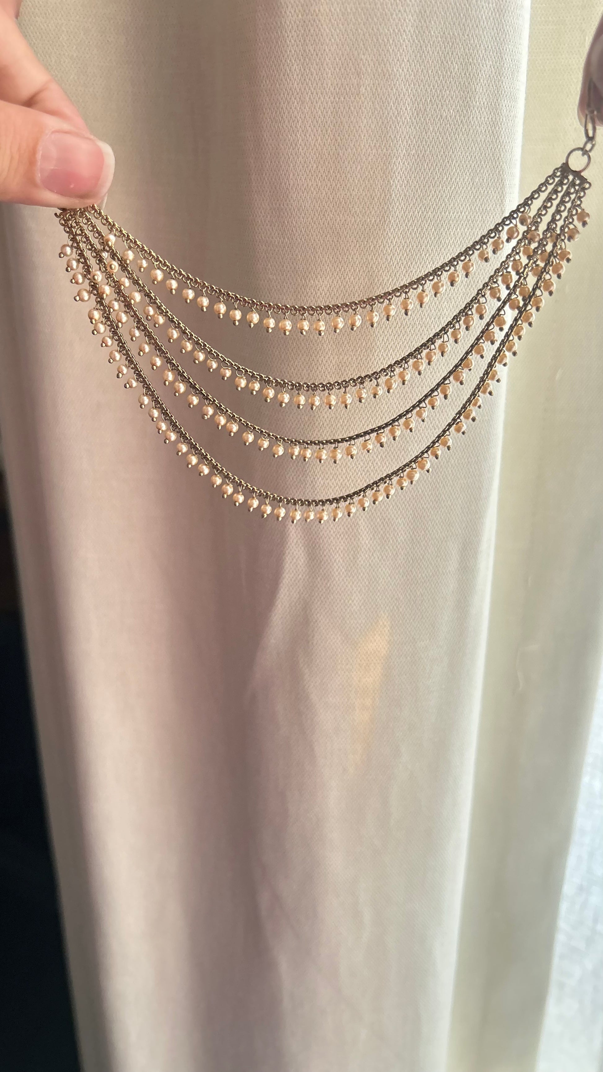Enrich your traditional outfits with the stunning Gold Sashi 5 Line Kaan Chain and pair it with any stylish earrings or studs of your choice. Perfect for weddings, this accessory will add a touch of glamour and elegance to your look.