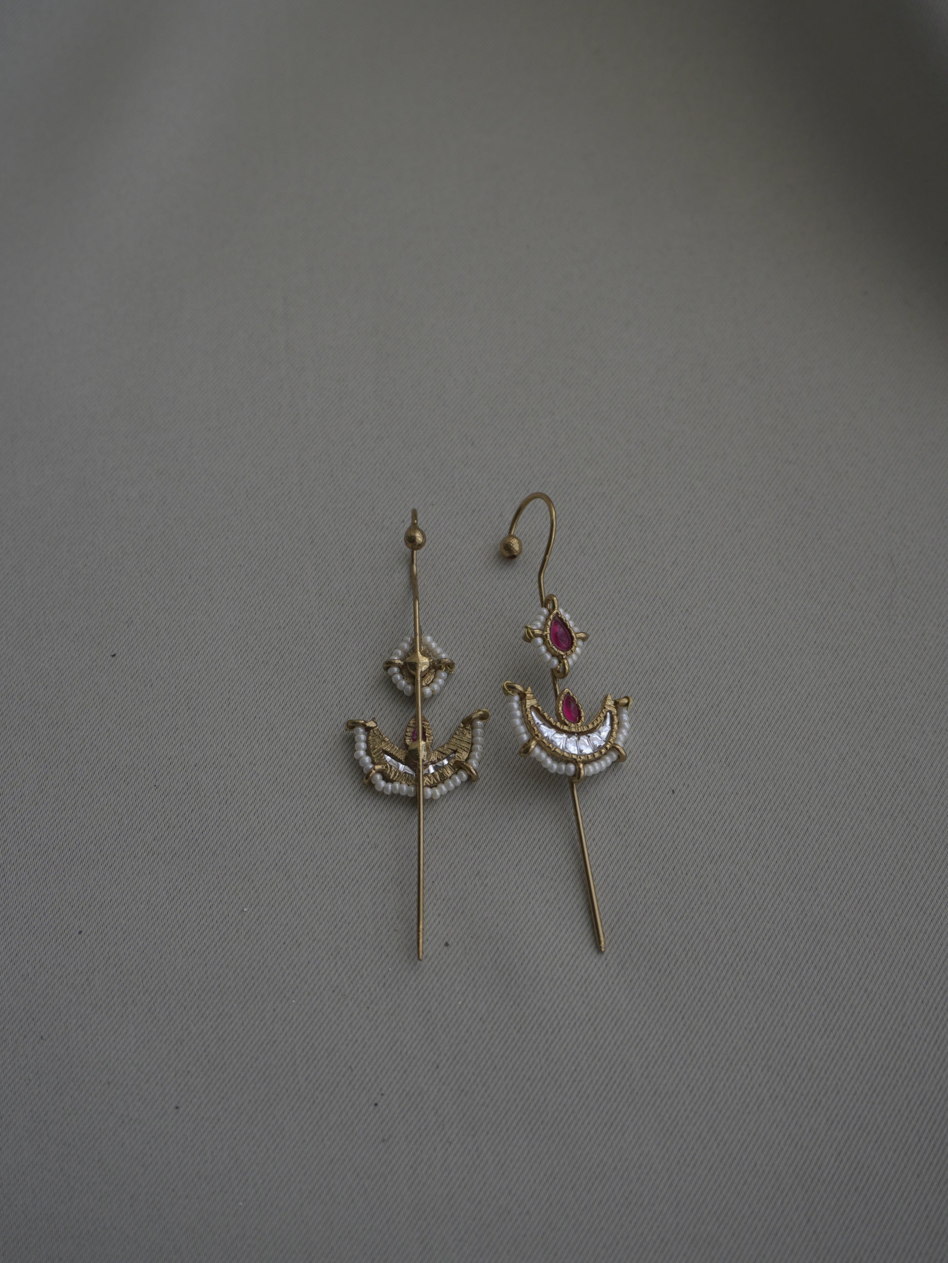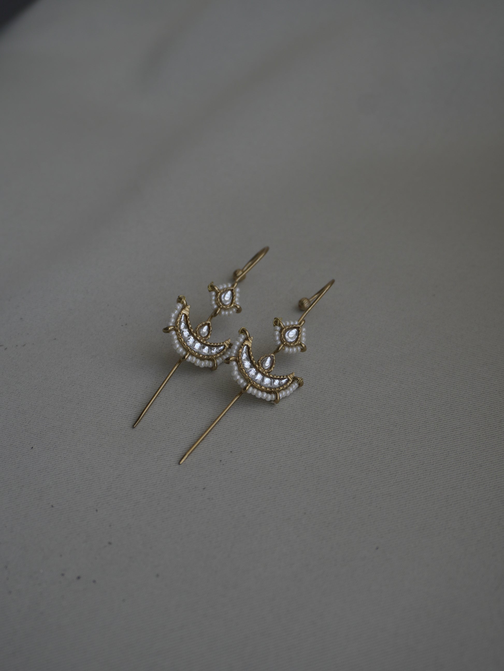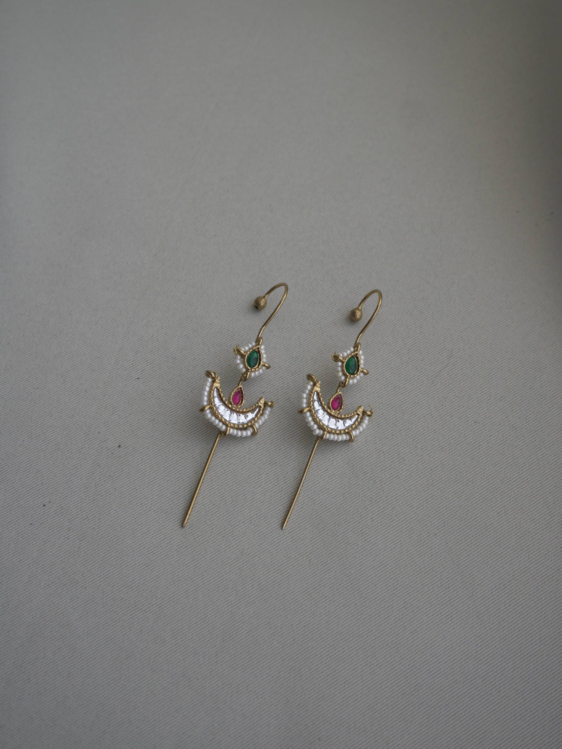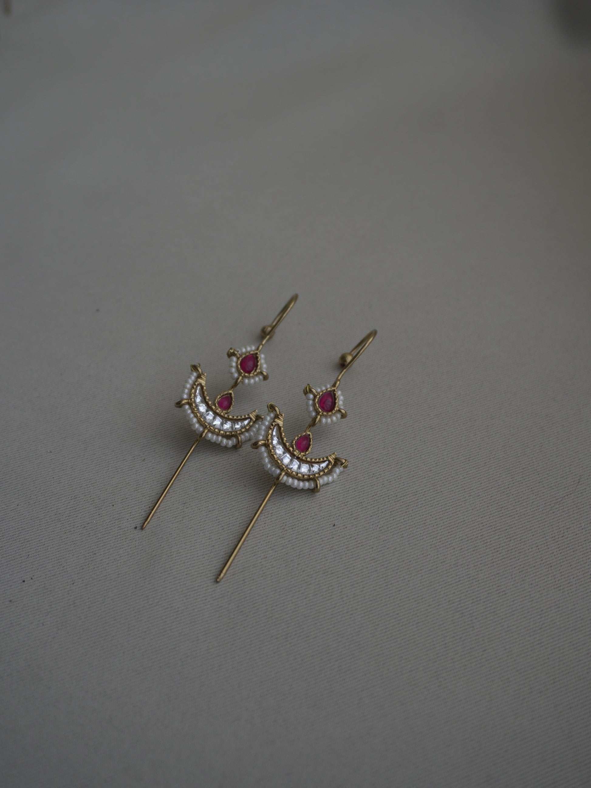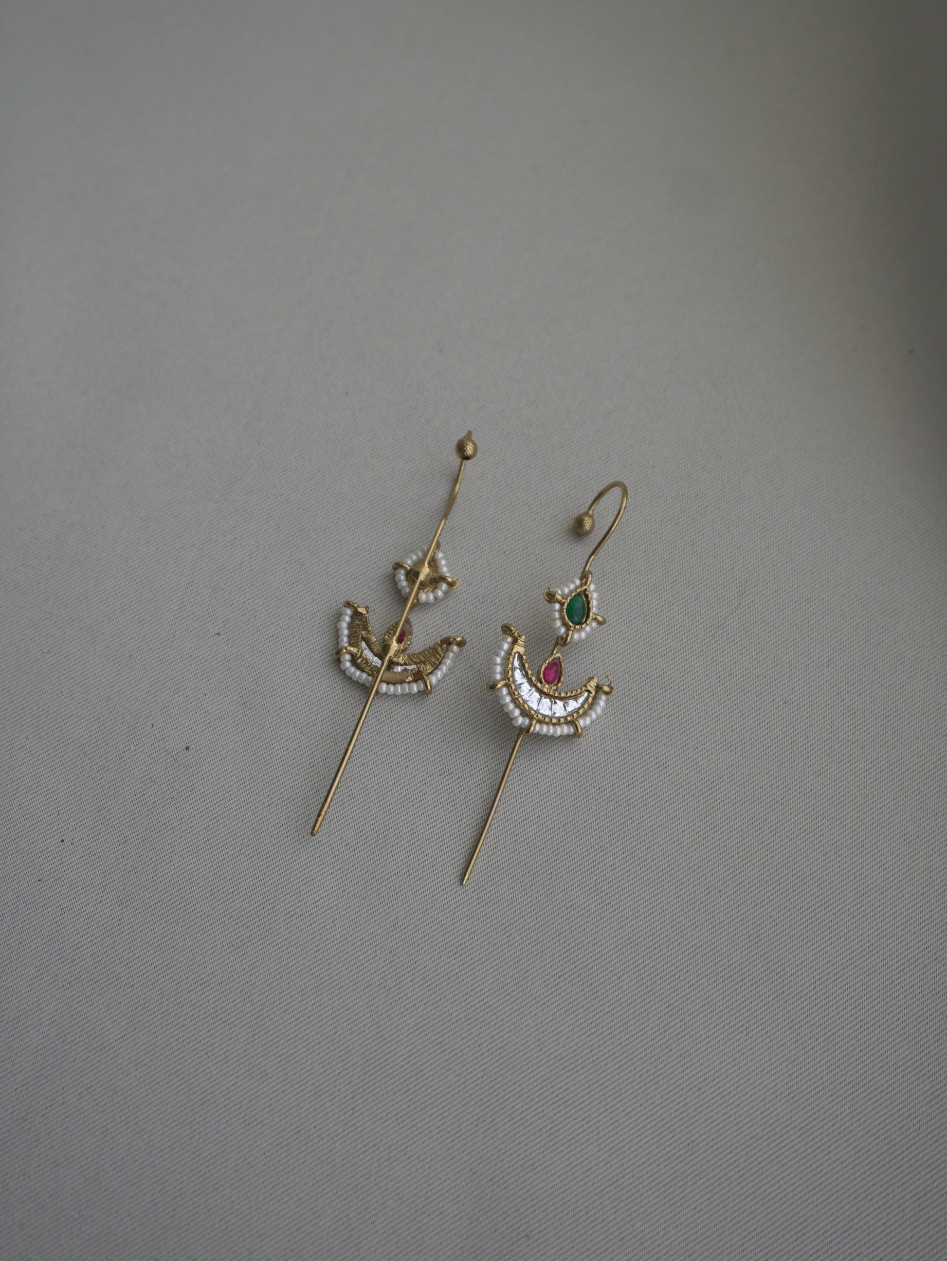 A festive crescent-shaped kundan ear cuff featuring a deep green stone and a ruby drop accent. Finished with mini pearls and an elegant chain that hugs the ear securely — perfect for creating a statement look without a piercing.