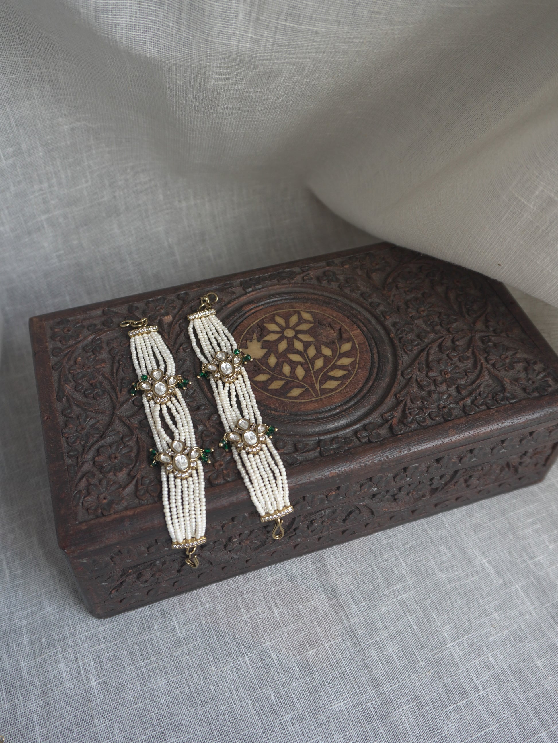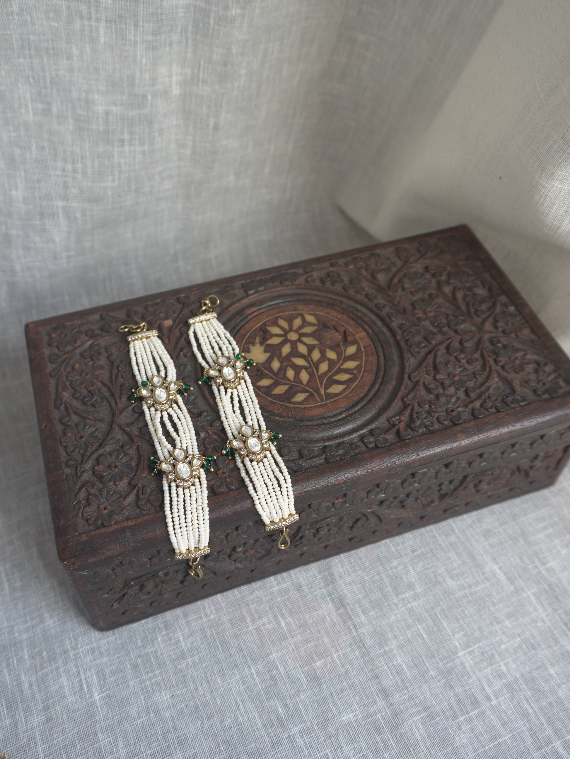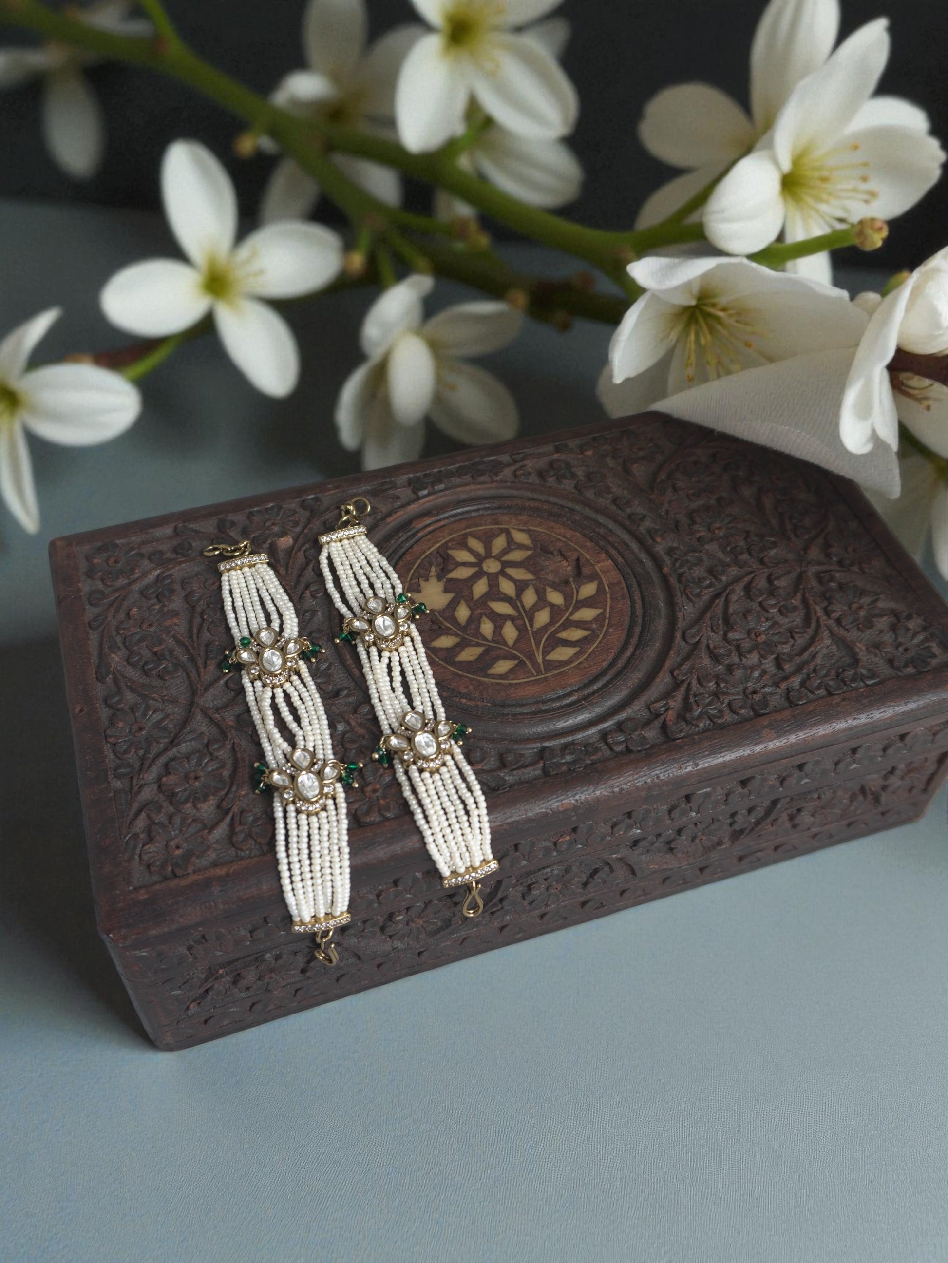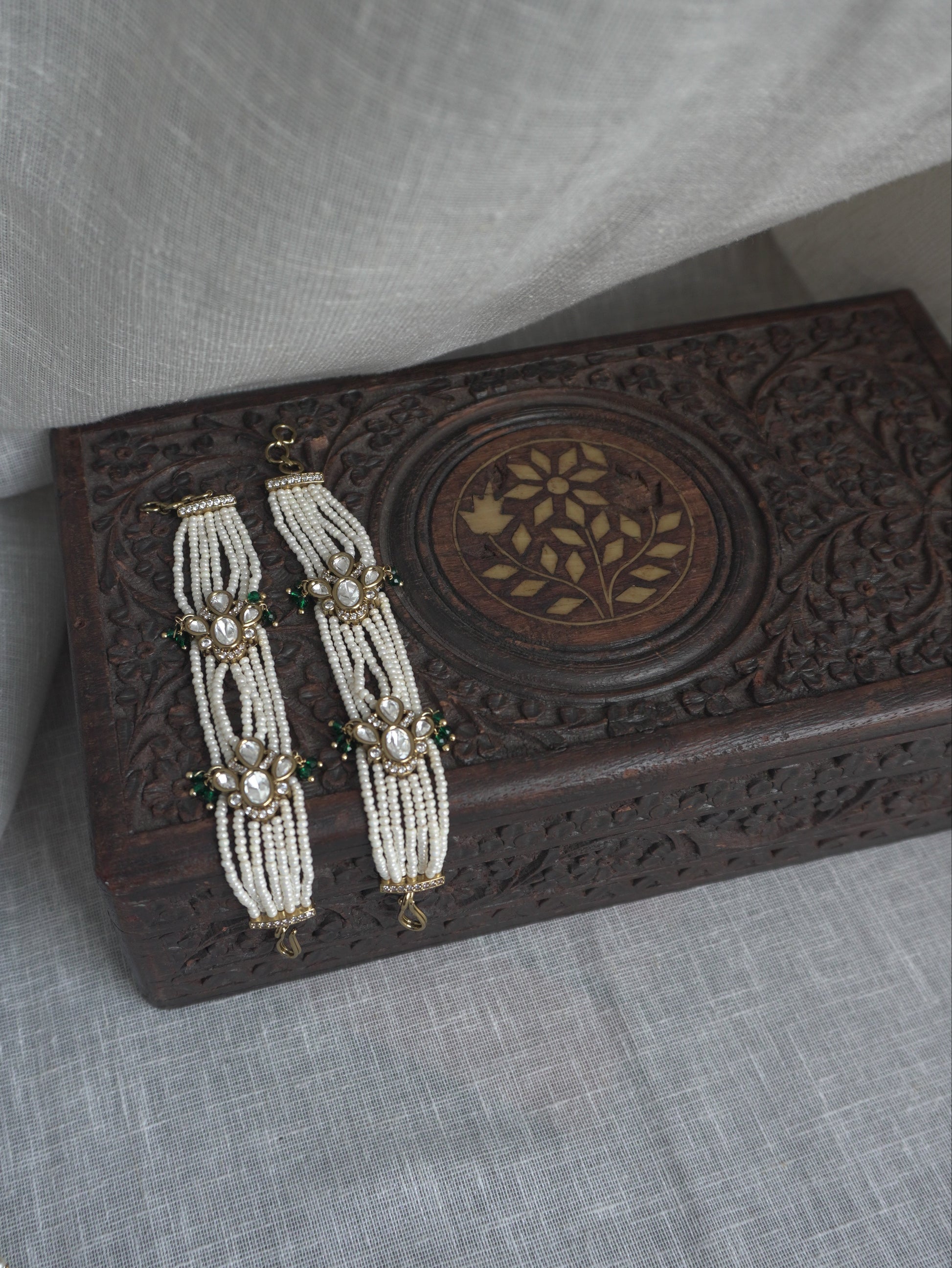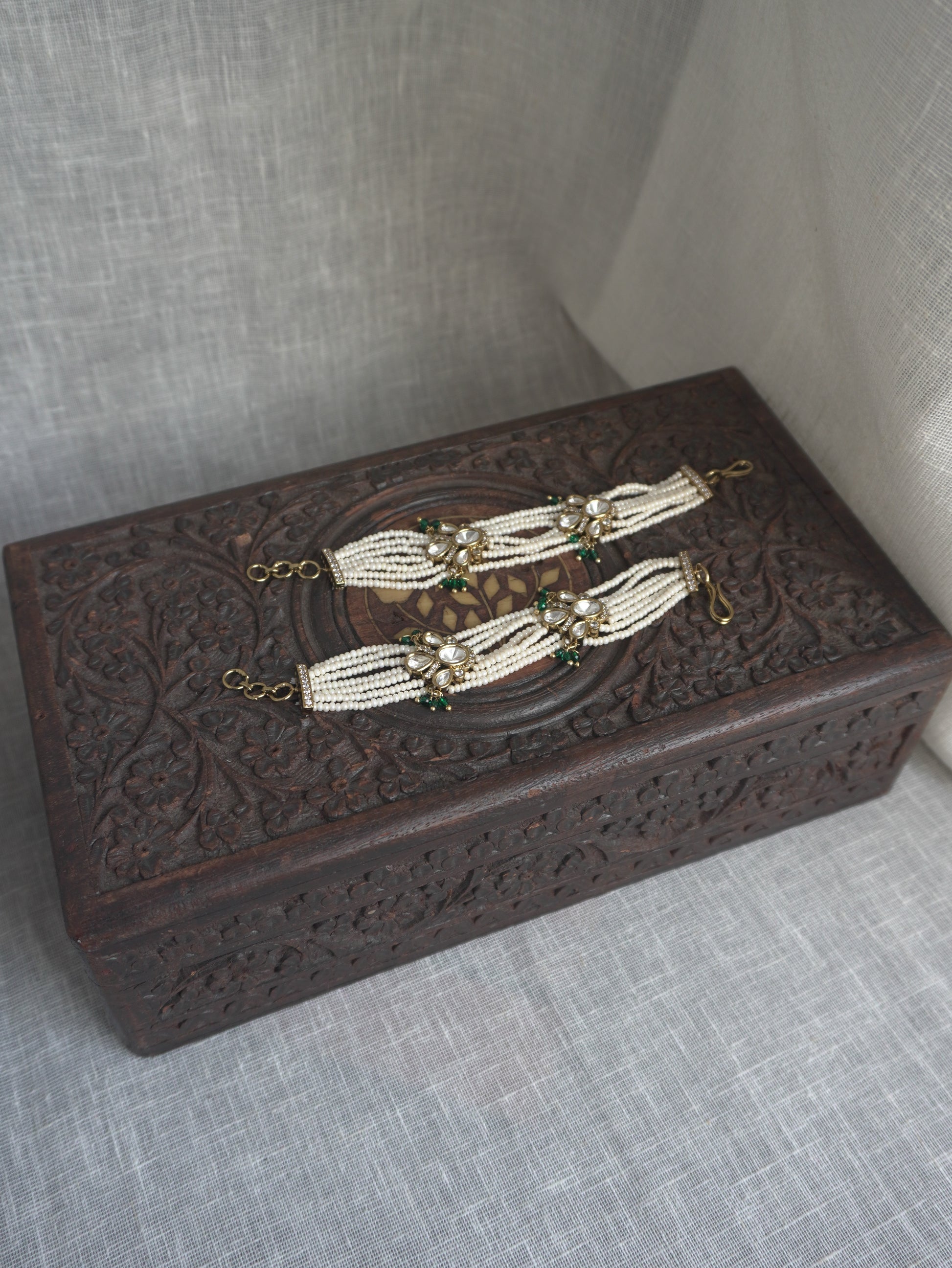The Meera Polki Pearl Kaan Chains are handcrafted with strings of pearls accentuated by polki florets and green meenakari hints. A regal touch for bridal or festive wear, these kaan chains exude timeless heritage and grace.