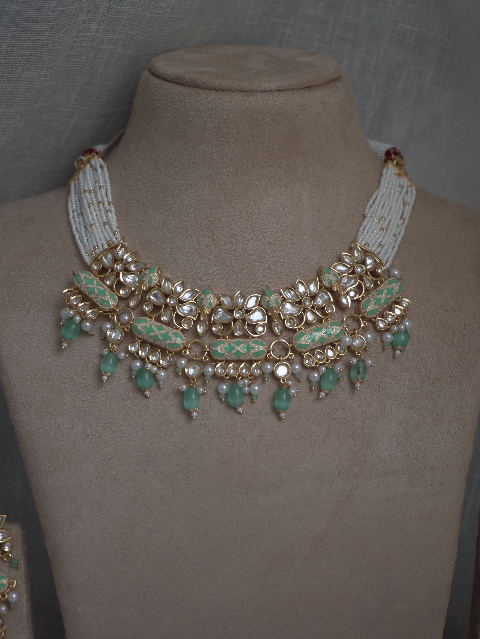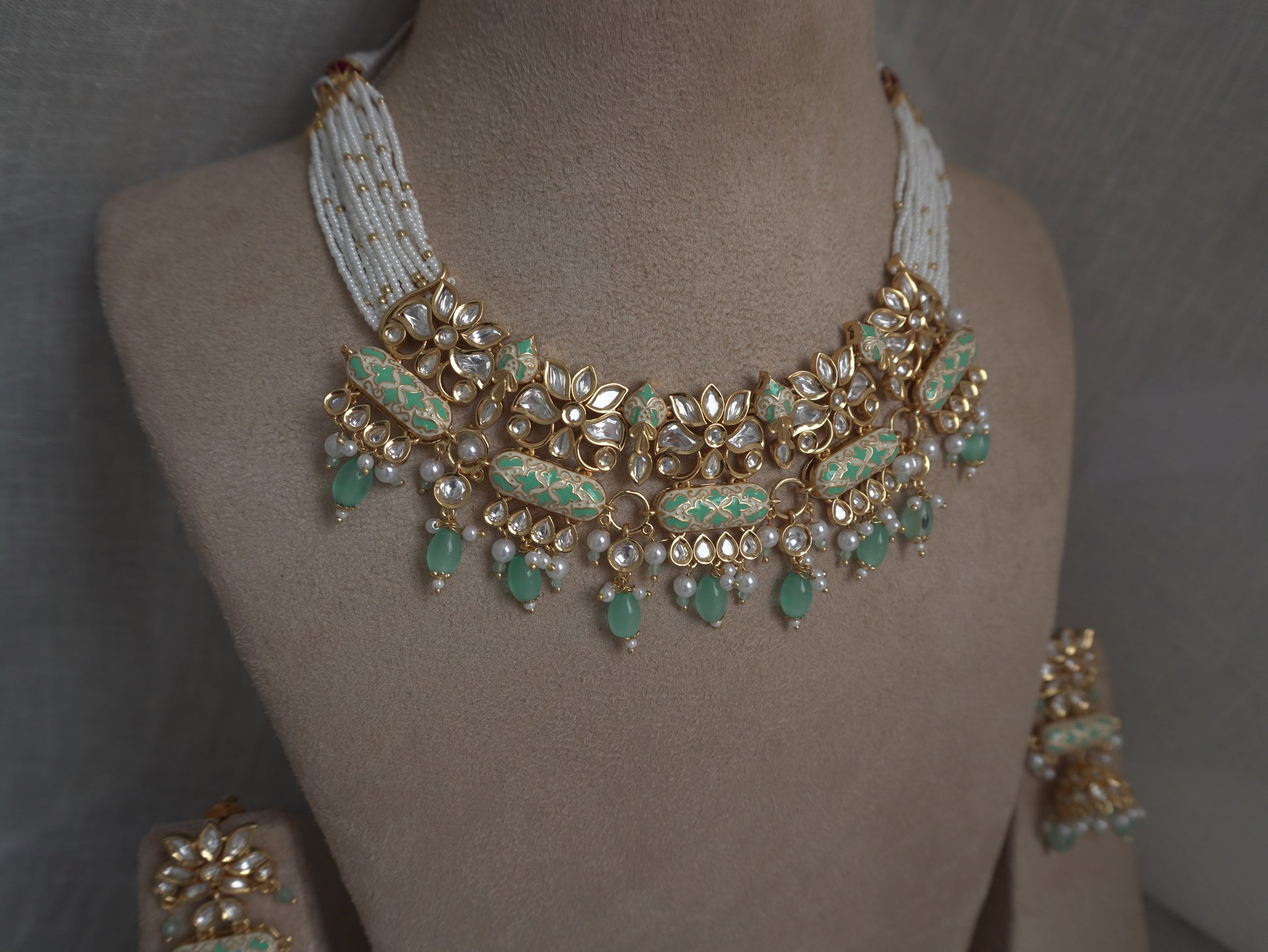 A stunning choker crafted with intricate mint green meenakari and real-looking polki work. Accented with pearl drops and floral motifs, this necklace brings together traditional artistry with a refreshing pastel elegance. A perfect choice for weddings, festive occasions, or bridal trousseau.