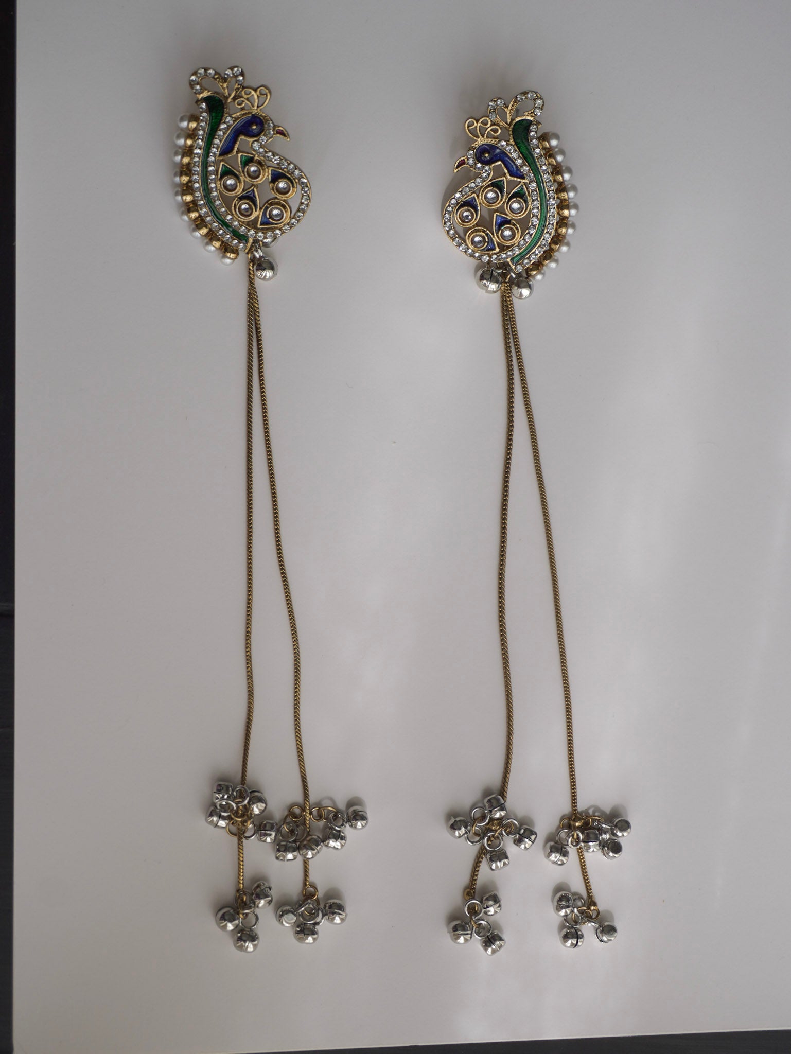 Inspired by traditional Kashmiri artistry, the Mor Kashmiri Pearl Earrings feature an intricately crafted peacock motif accented with delicate enamel detailing and kundan-style stones. The long twin-chain drops finished with clustered pearl bunches create graceful movement, making this pair a striking choice for festive and wedding styling.