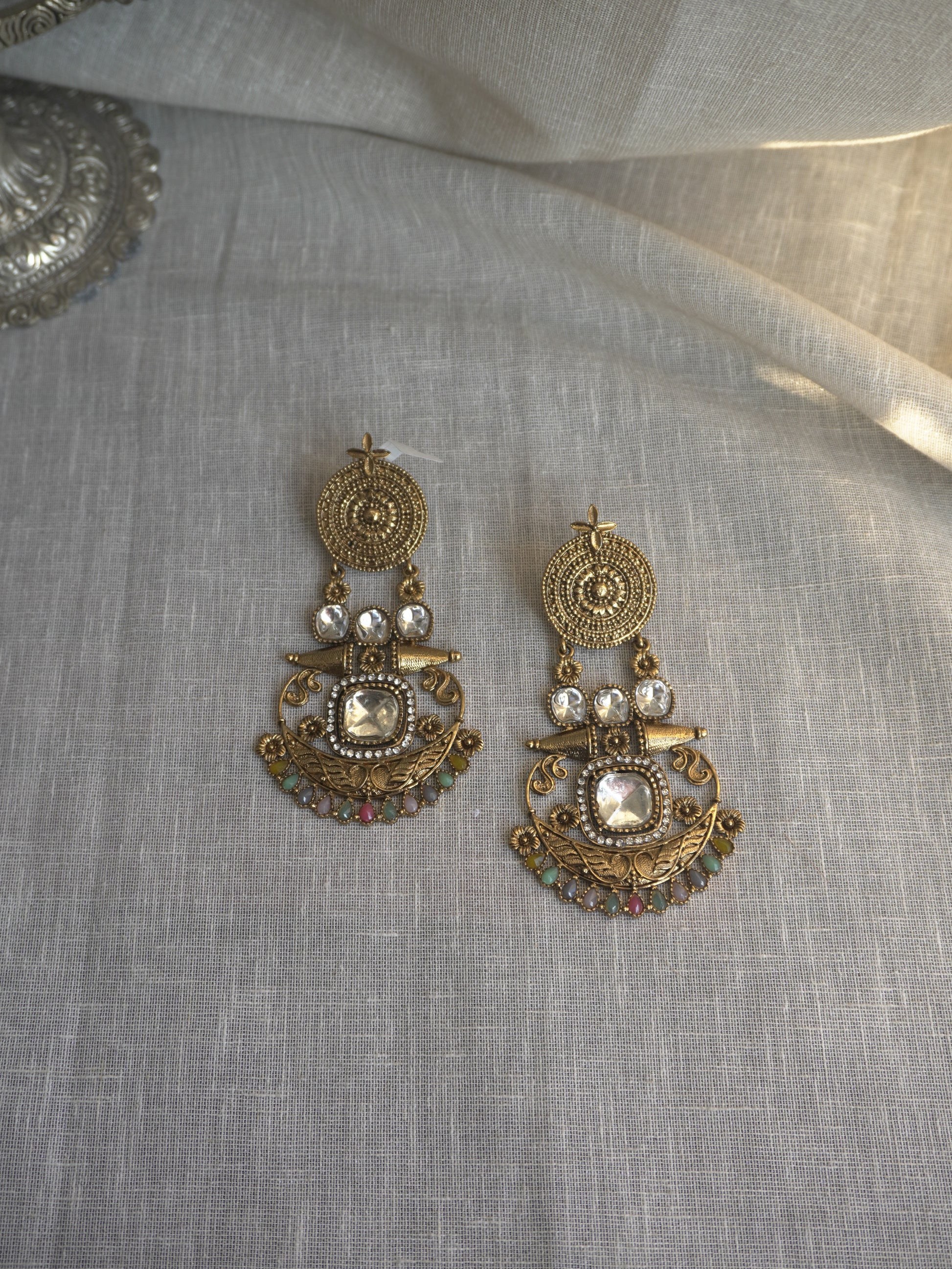 A timeless pair crafted in antique gold tones, the Navya Antique Kundan Earrings feature intricate heritage-inspired detailing with a luminous kundan centre and delicate multicolour accents. Designed to elevate festive, wedding, and ethnic looks effortlessly, these earrings bring old-world charm with modern wearability.