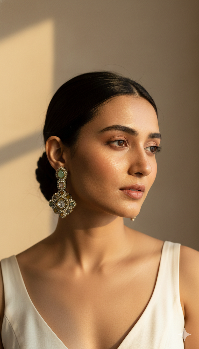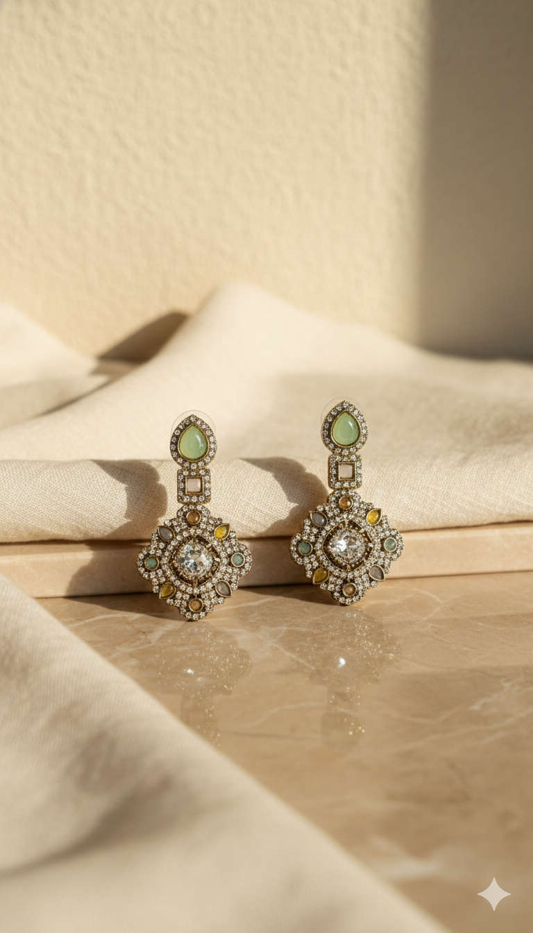 Statement drop earrings featuring a mosaic-inspired design with soft pastel stone accents and a crystal centre. Elegant yet striking, these earrings are perfect for festive occasions, weddings, and elevated evening looks.