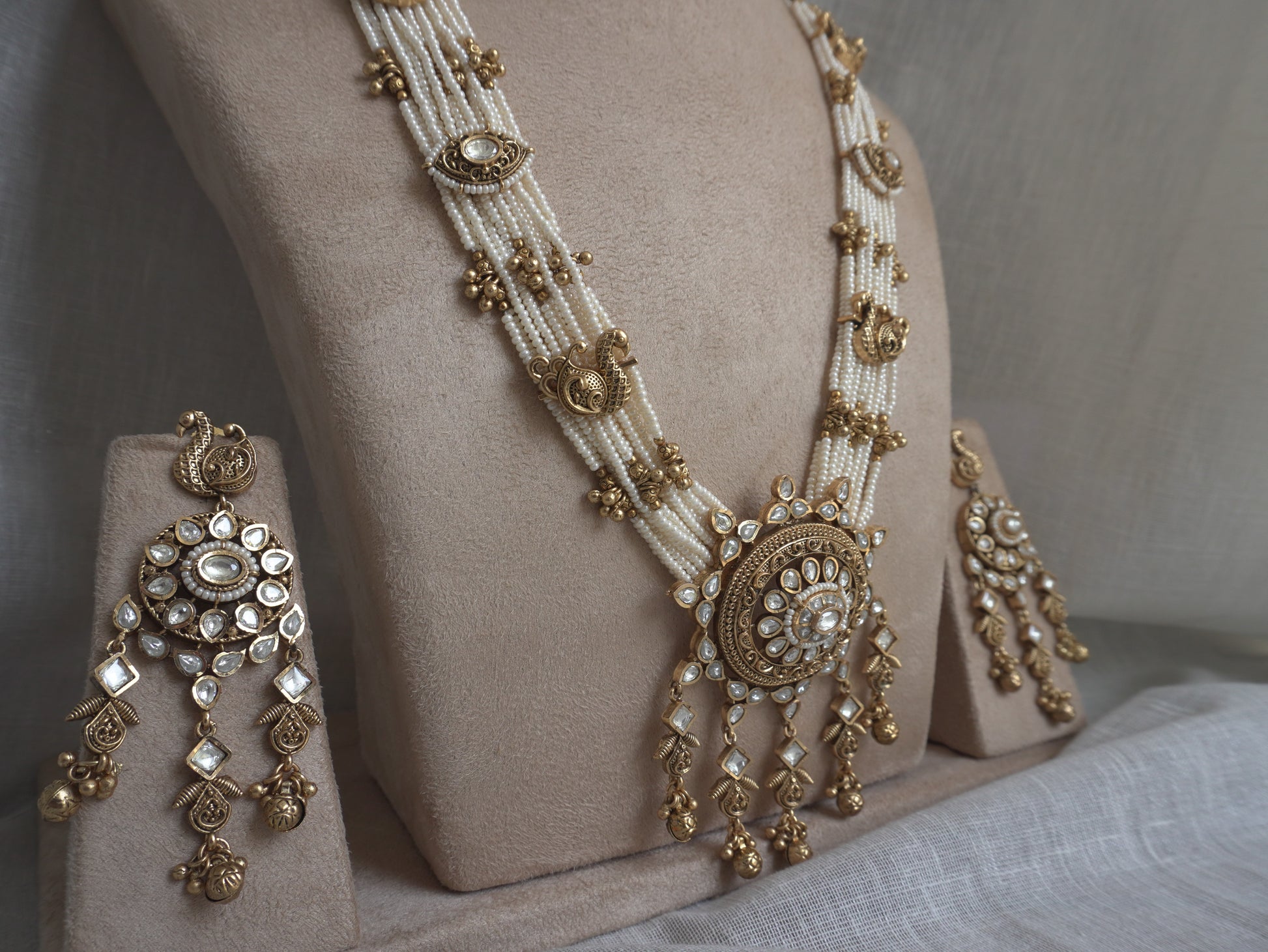 The Raga Collection is an ode to temple-inspired heritage jewellery, crafted with timeless detailing and antique finishes. Each piece brings together the grandeur of polkis, pearls, and kundan artistry, creating heirloom-worthy designs that resonate with tradition while complementing modern elegance. Perfect for weddings, festive occasions, and statement styling, Raga captures the rhythm of heritage in every silhouette.