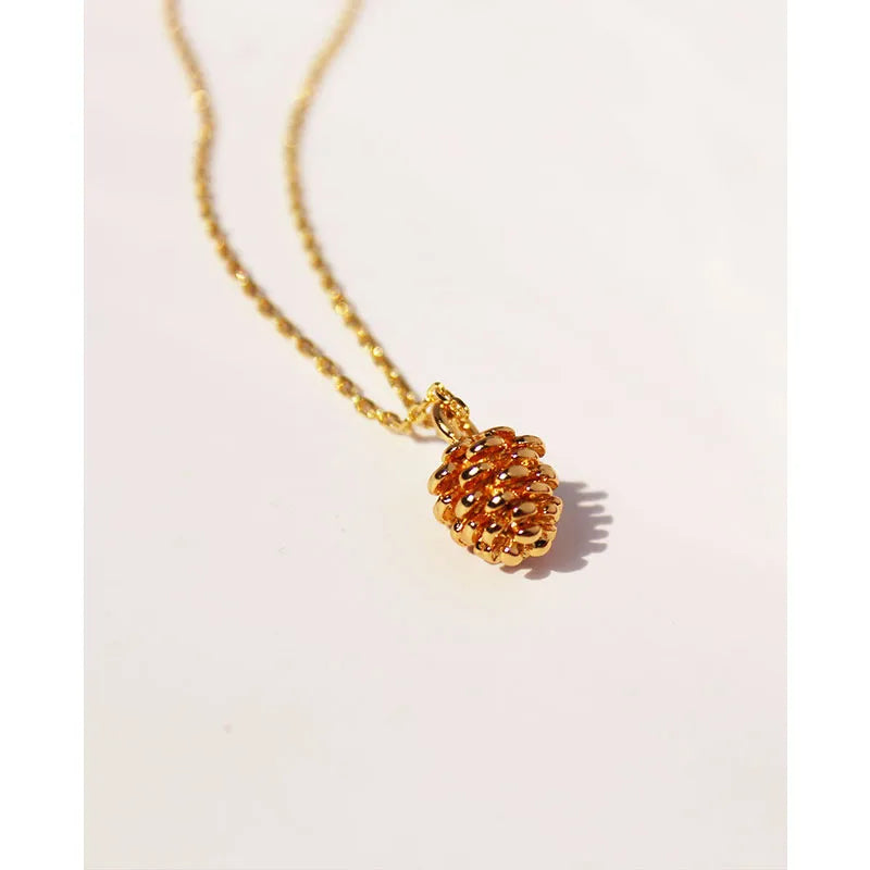 A charming ode to nature, this pine cone pendant is a subtle statement of elegance and whimsy. Crafted in polished 24K gold-plated brass, it adds a playful yet classic touch to outdoor brunches, city strolls, or evening soirées.