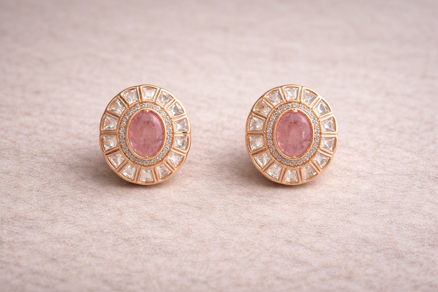 Soft pink centre stones surrounded by a halo of sparkling crystals, framed in a warm gold finish. Elegant and refined, these studs add a subtle pop of colour while remaining easy to style for both everyday wear and special occasions.