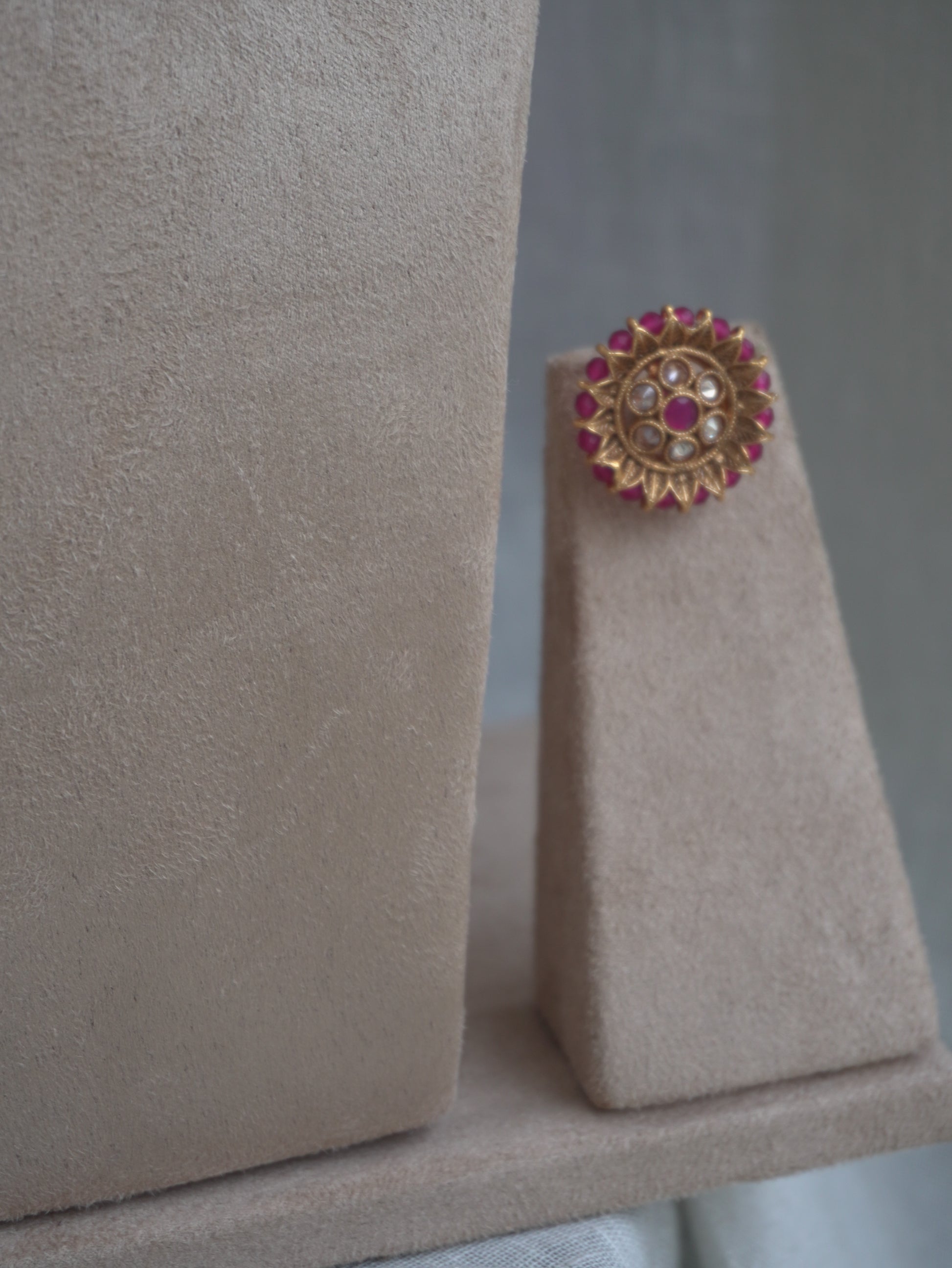 A bold and striking choker made with deep pink beads, paired with matching stud earrings. This contemporary yet traditional piece is a versatile statement for both festive and evening wear.