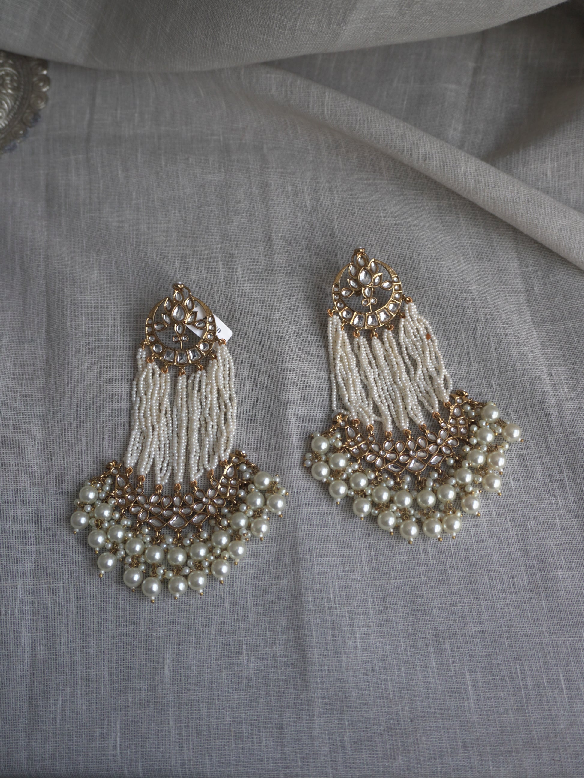 Gracefully detailed and endlessly elegant, the Prisha Pearl Tassel Chandbaali brings together classic polki craftsmanship with soft pearl cascades. The intricate upper motif flows into delicate pearl tassels, creating a statement silhouette that feels regal yet wearable. Ideal for weddings, festive evenings, and elegant celebrations.