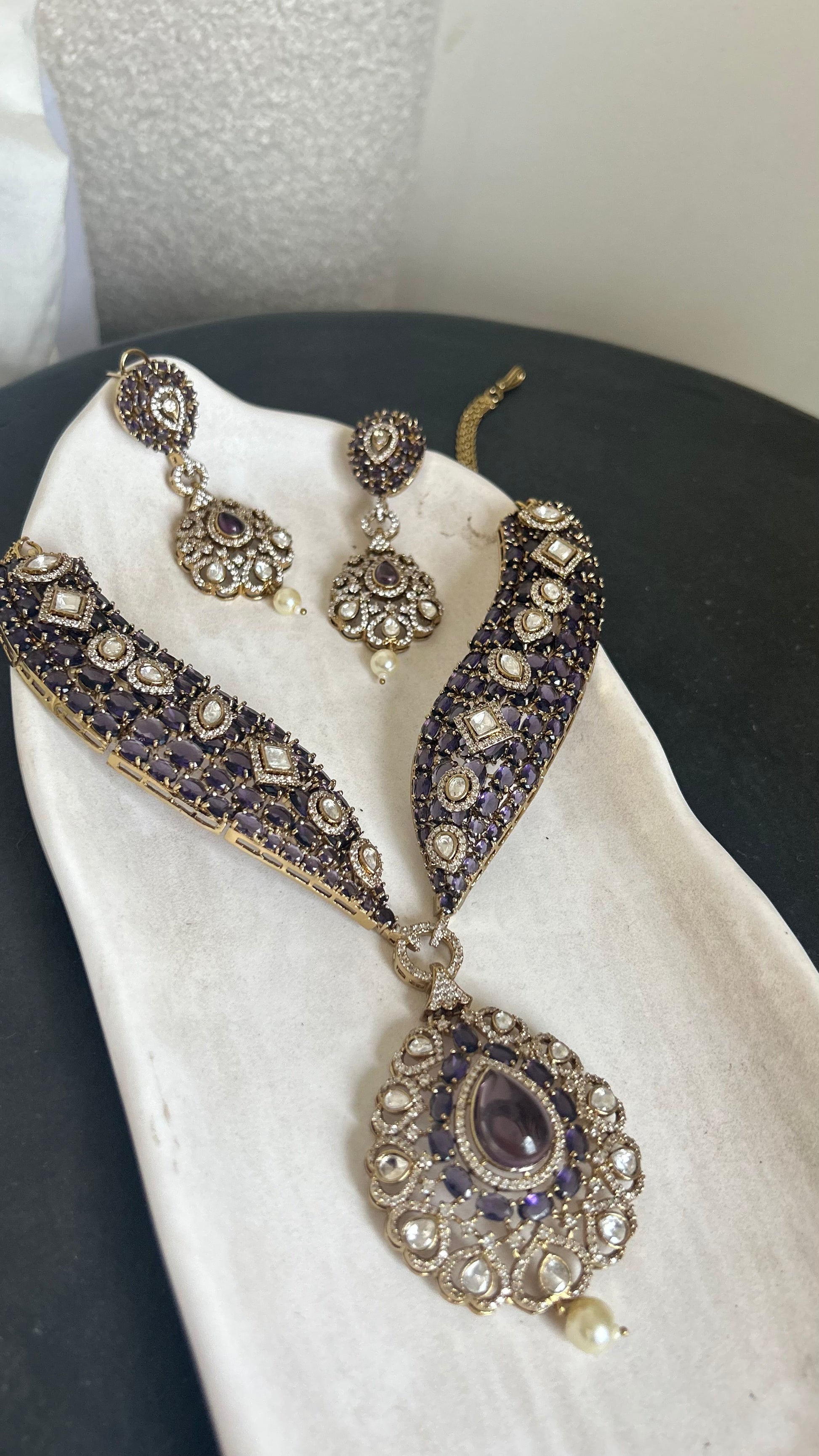 A regal necklace set crafted with deep purple stones, Polki work, and delicate pearls, making it an heirloom-inspired piece for evening wear.