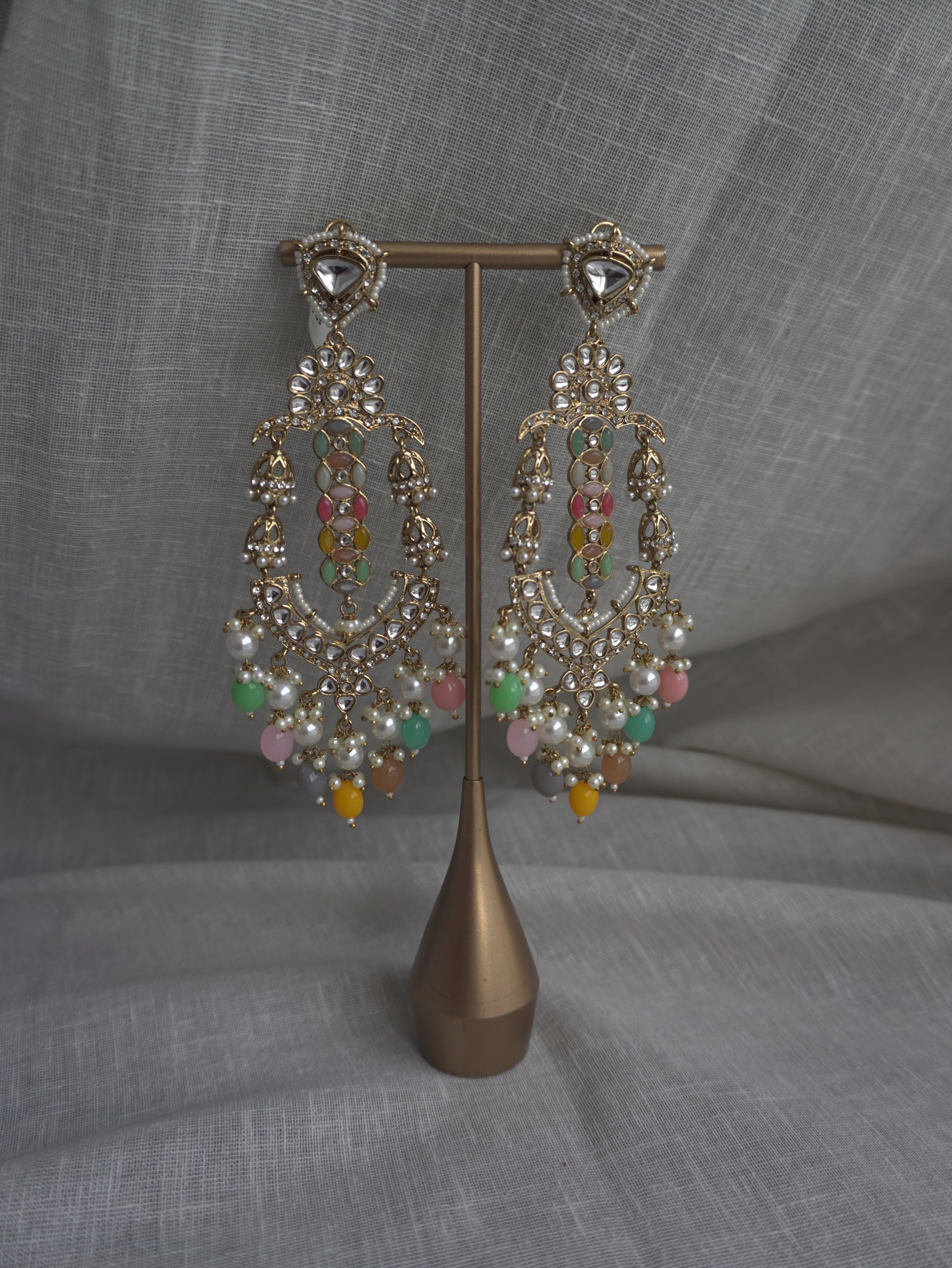 Vibrant, festive, and unapologetically fun — the Rangreza Chandeliers are a burst of colour and charm. With multicoloured beads, pearl hangings, and intricate crystal detailing, these earrings are perfect for Mehendi, Haldi, and all your celebratory looks.