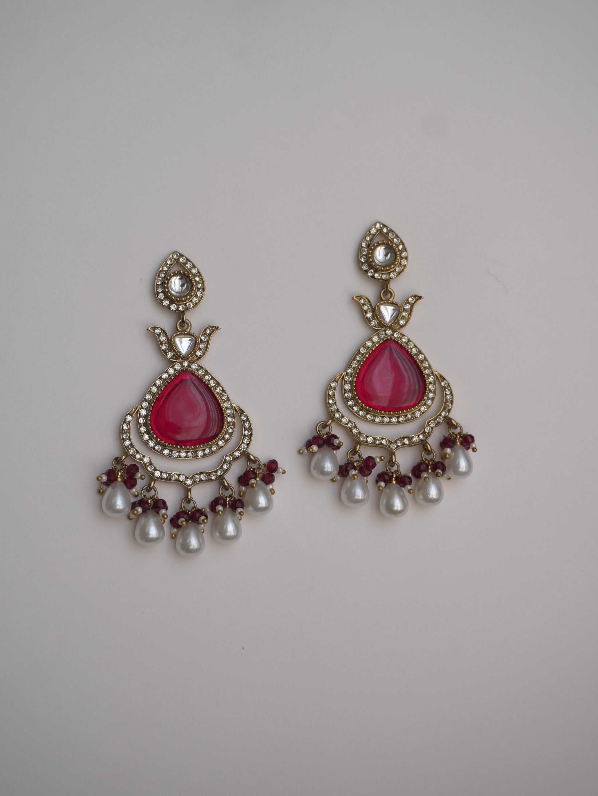 • Material: Gold-tone alloy with deep red stone, crystal detailing & pearl bead drops