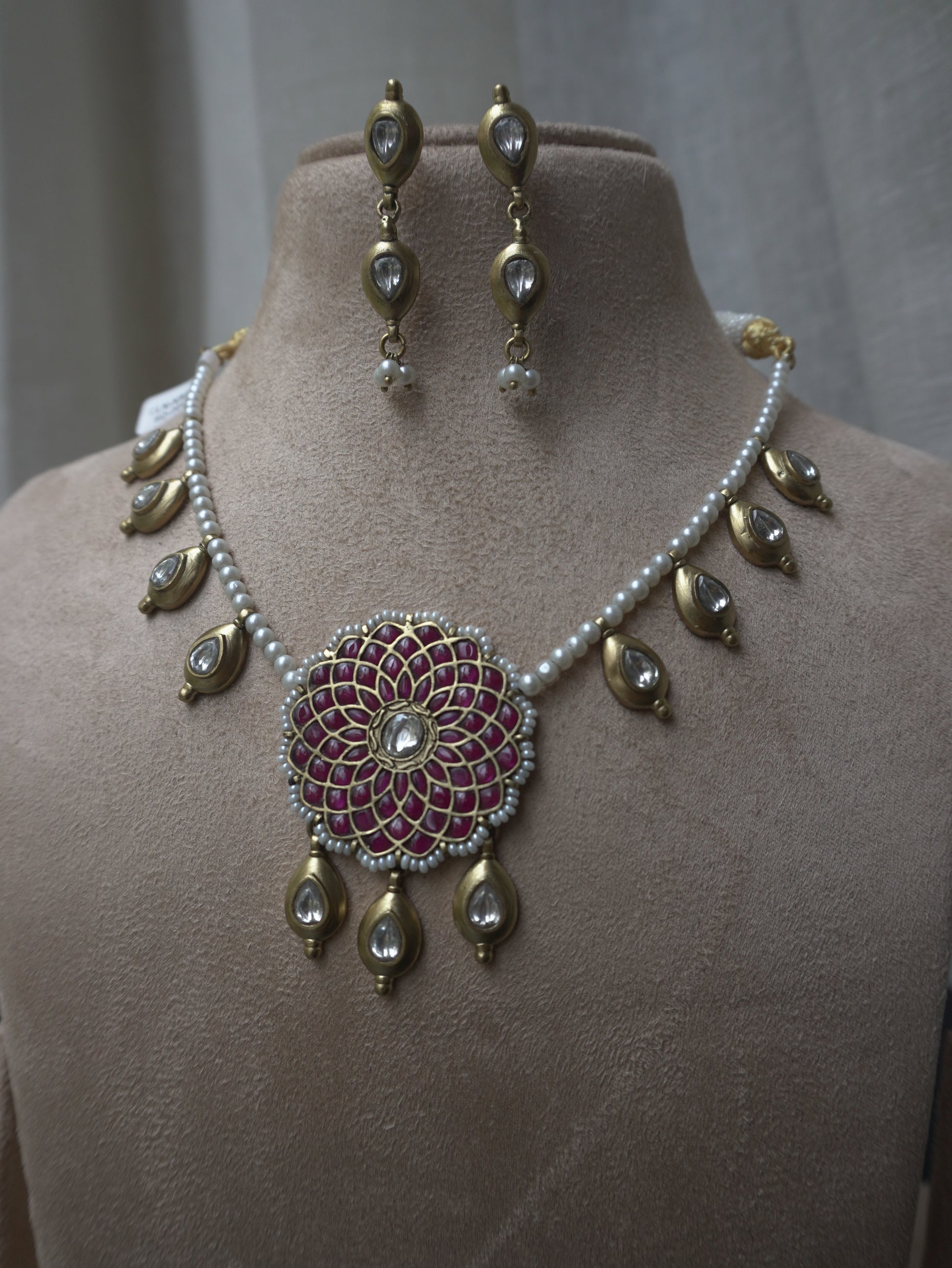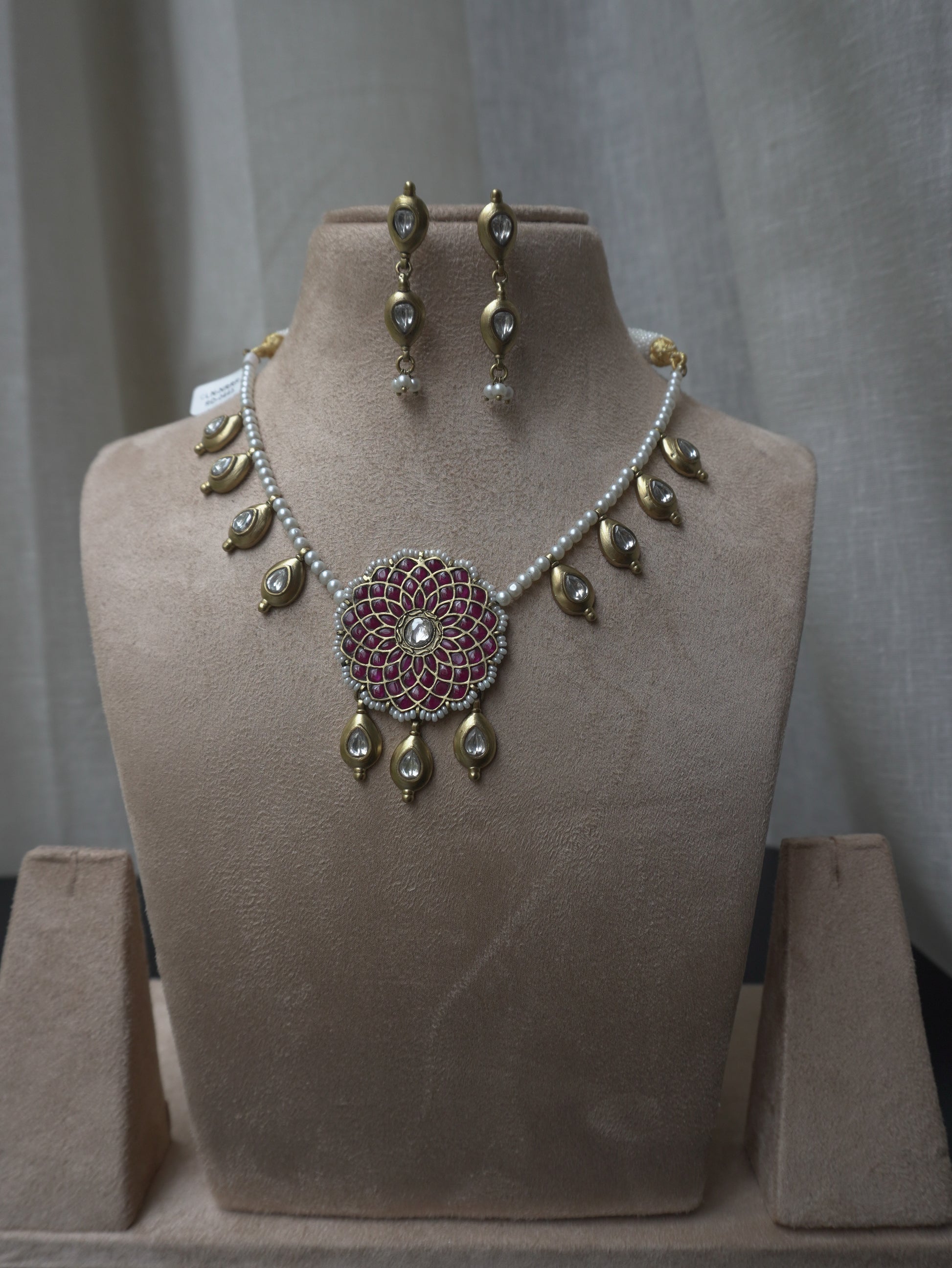 An exquisite floral-inspired necklace featuring a central lotus motif with ruby accents, pearls, and Polki. A striking blend of colour and heritage charm, finished with matching earrings.