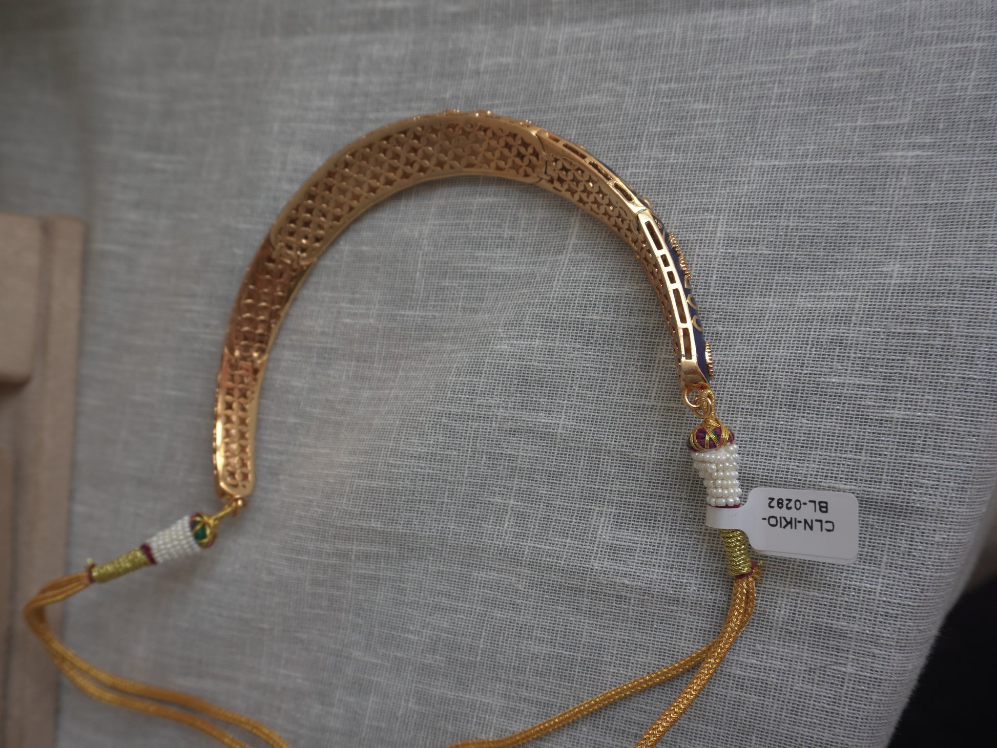 A regal hasli-style necklace, crafted with deep blue enamel, Polkis, and delicate golden detailing. Paired with matching earrings, this set carries a modern heirloom feel — bold yet timeless, perfect for evening elegance.