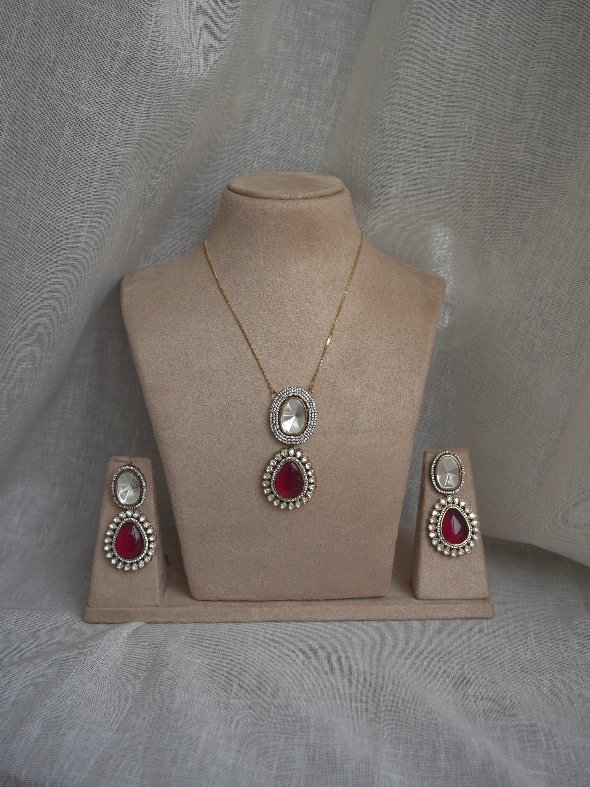 Featuring ruby red teardrops with kundan solitaire accents, this necklace set captures timeless heritage charm. Perfect for bridal and festive ensembles.