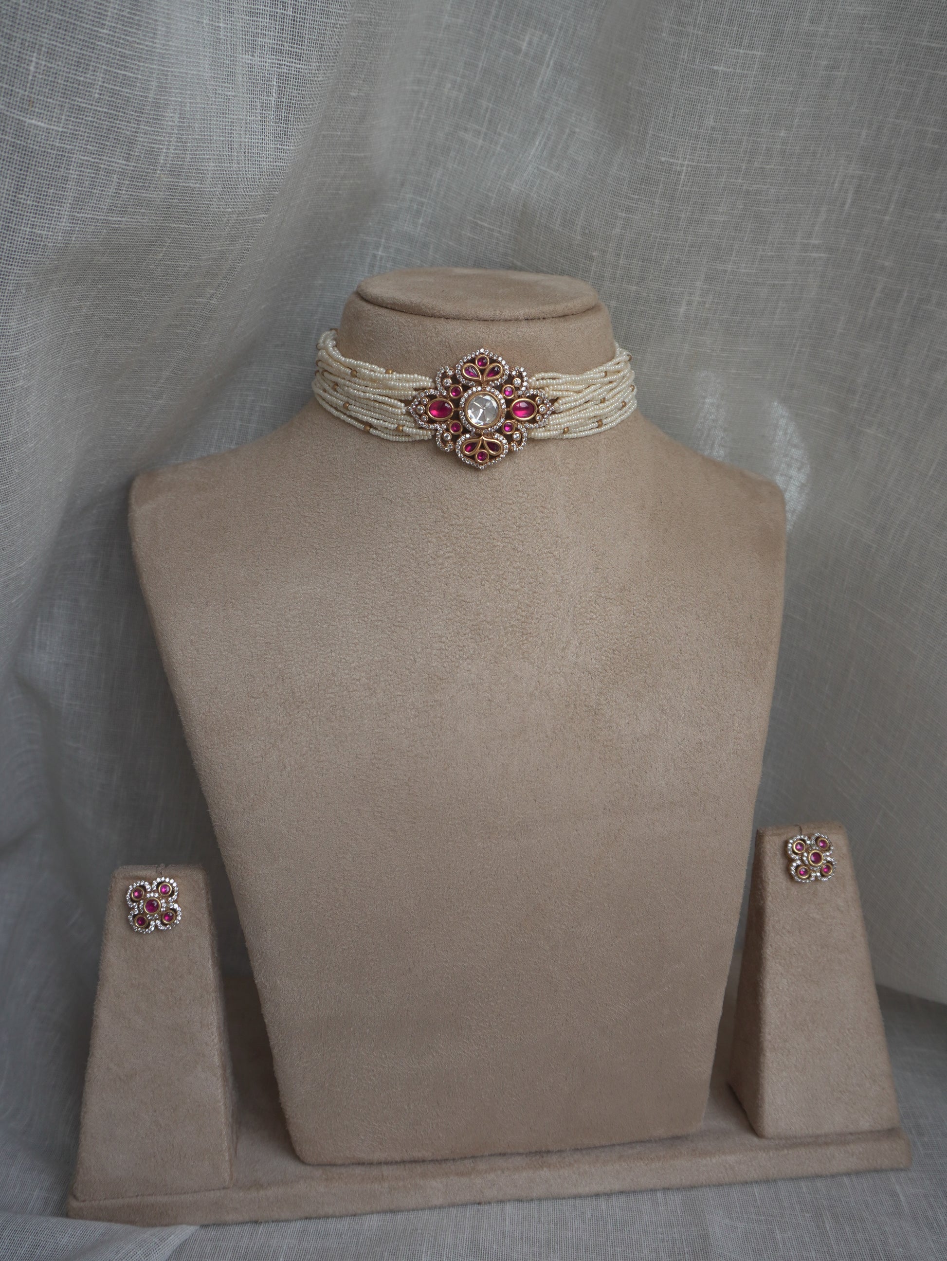 A striking choker designed with layers of delicate pearls and a central ruby-toned motif set with polkis. The intricate detailing adds vintage charm, while the matching studs complete the regal appeal. Perfect for weddings, sangeet nights, and festive occasions.