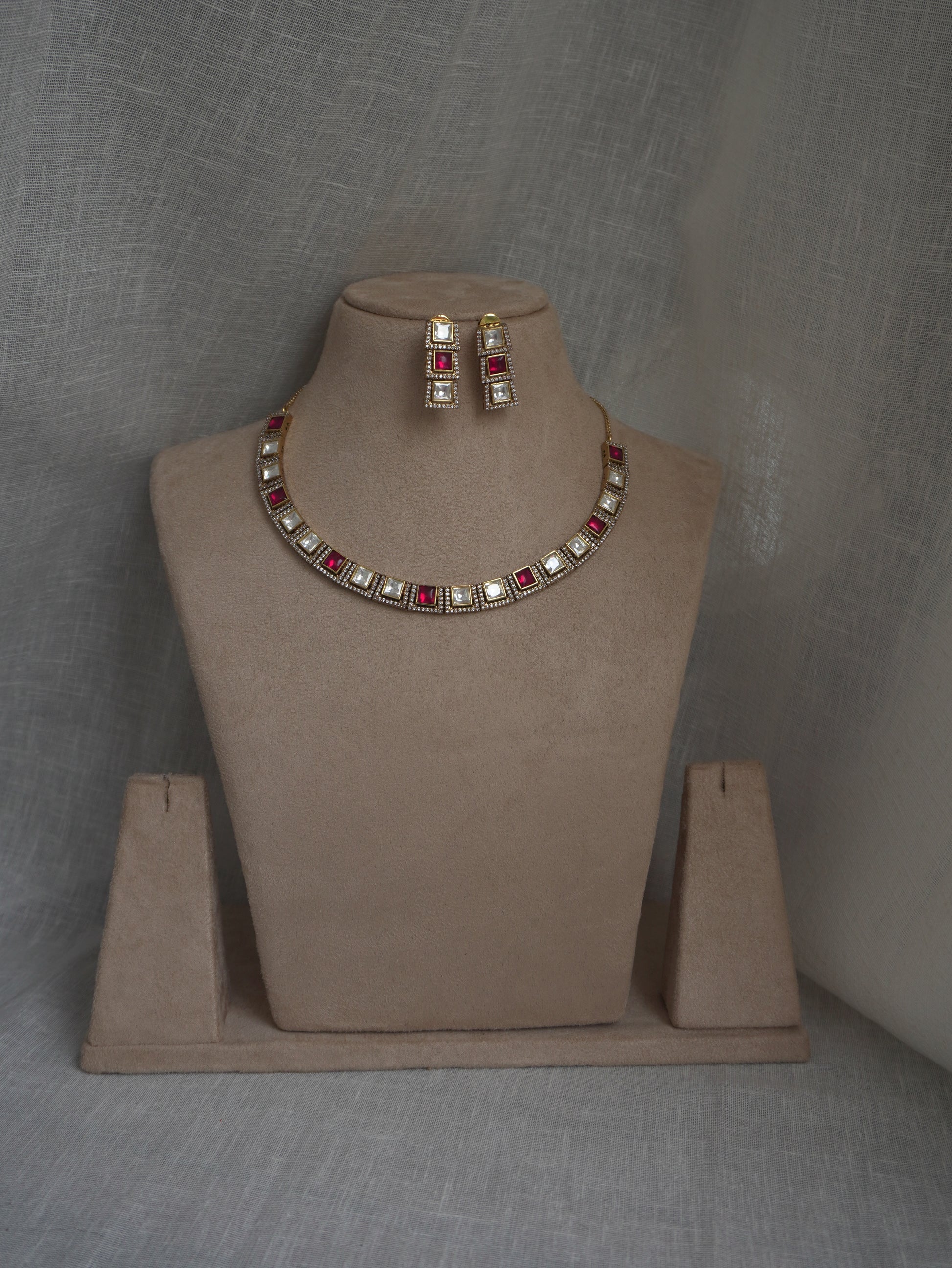 A striking necklace set designed with alternating ruby red and polki squares, bordered by sparkling crystals. The bold geometric design adds a contemporary edge while keeping a festive charm, making it perfect for weddings, parties, and special celebrations. Comes with matching drop earrings for a complete look.