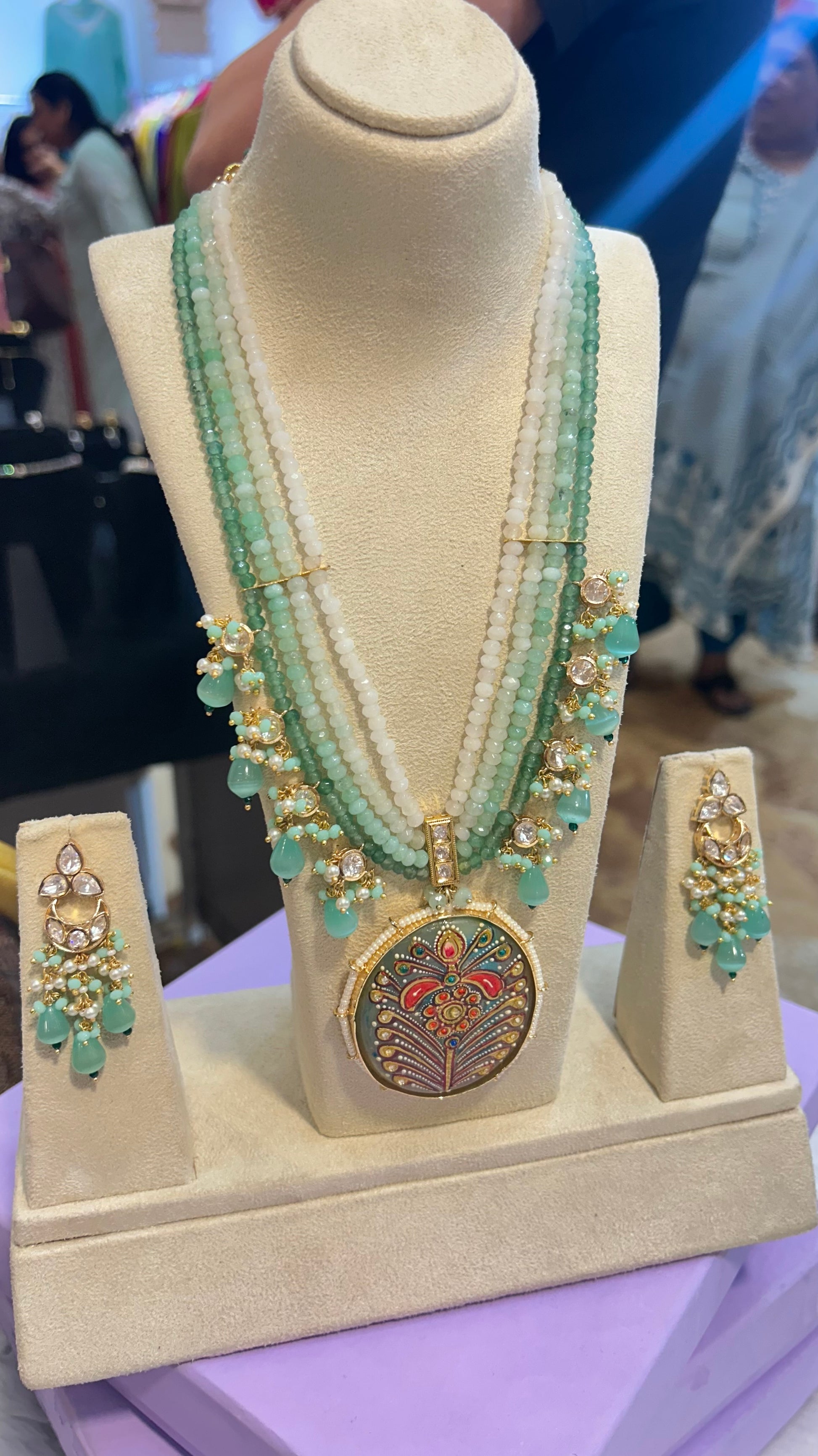 Indulge in the natural beauty of the forest with our Shades of Forest Necklace. Handpainted unique stone with shades of green and adorned with Mossanite Polki & Beads, this one-of-a-kind piece exudes elegance.