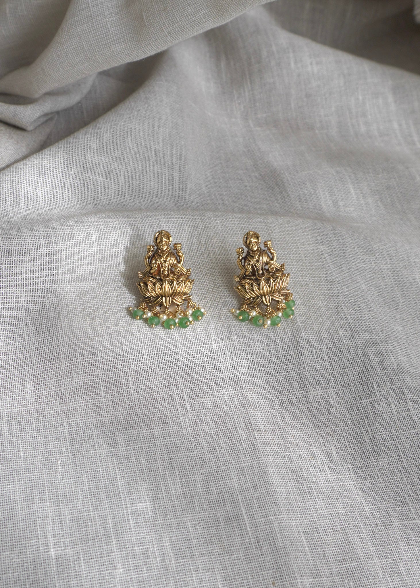 Inspired by traditional South Indian temple jewellery, these Temple Stud Earrings feature an intricately crafted deity motif finished in an antique gold tone. Highlighted with delicate green bead detailing, they add a timeless, heritage charm to festive and traditional looks.