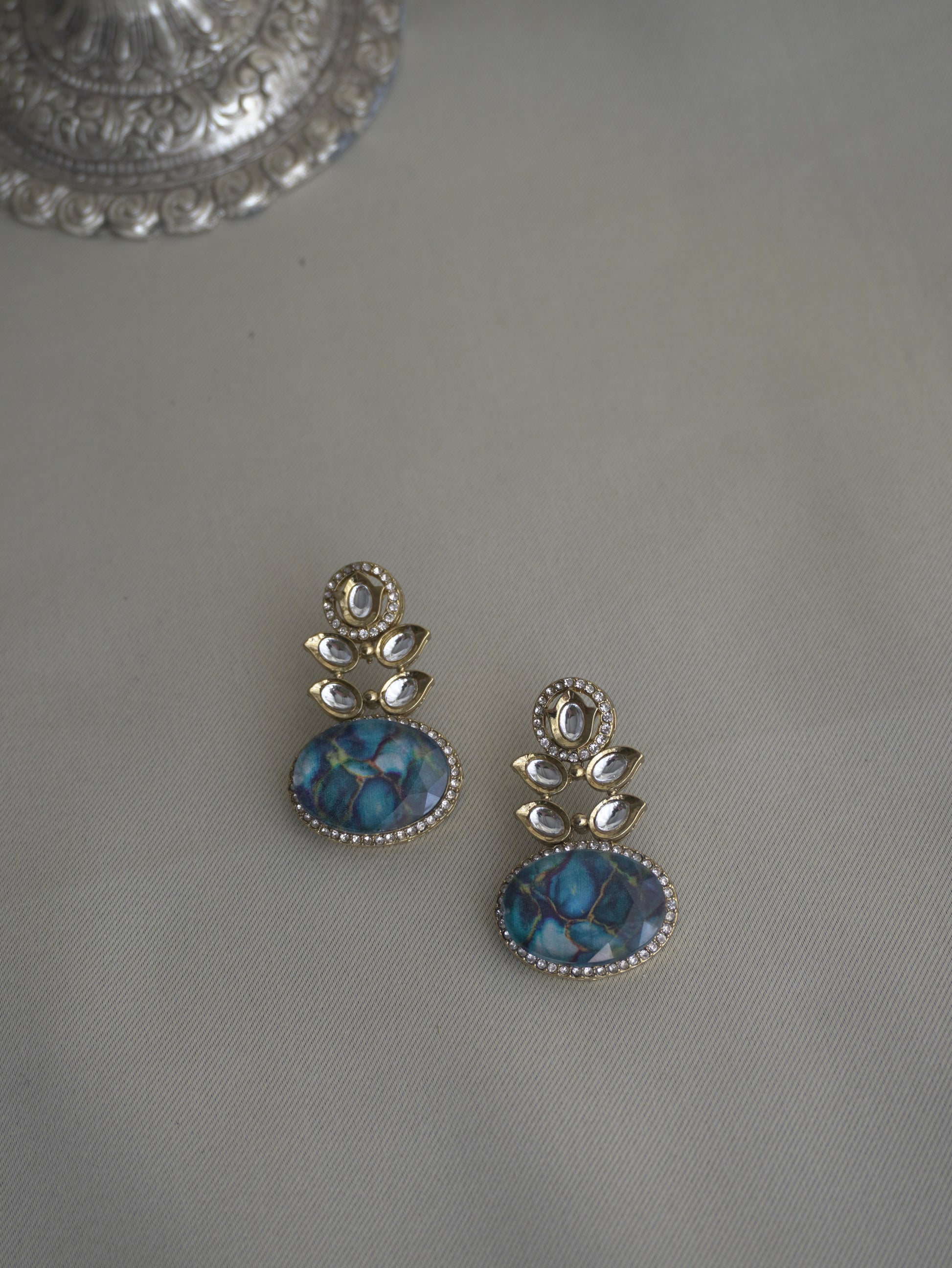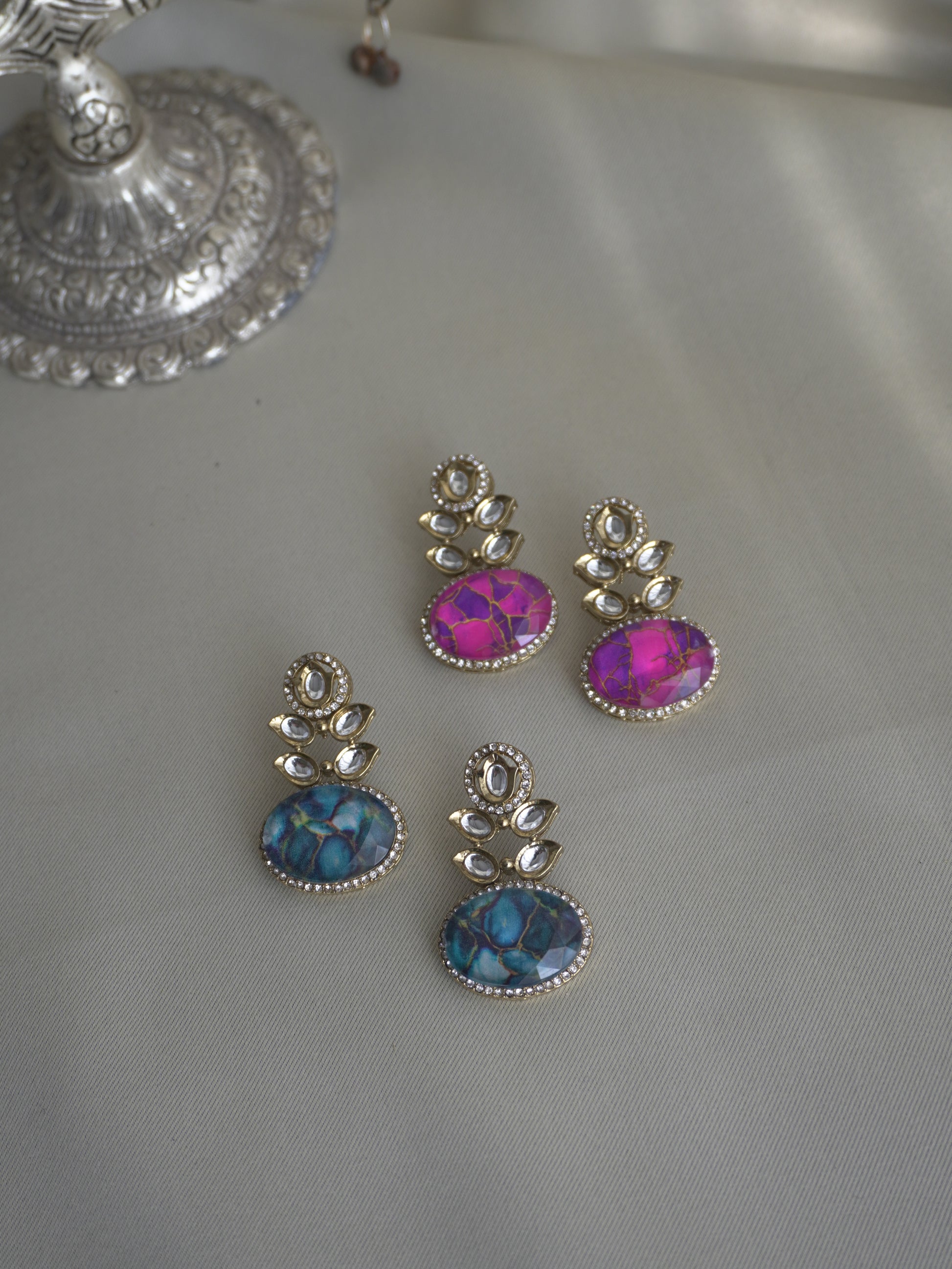 The Vaidehi Earrings are your perfect pick for everyday glam — lightweight, colourful and designed to brighten any outfit instantly. Crafted with a cracked-glass centre stone and surrounded by antique gold detailing, these earrings add the right pop of colour without feeling over the top. Whether you’re dressing up for lunch, college, work, or a festive evening, Vaidehi blends effortlessly into every look.