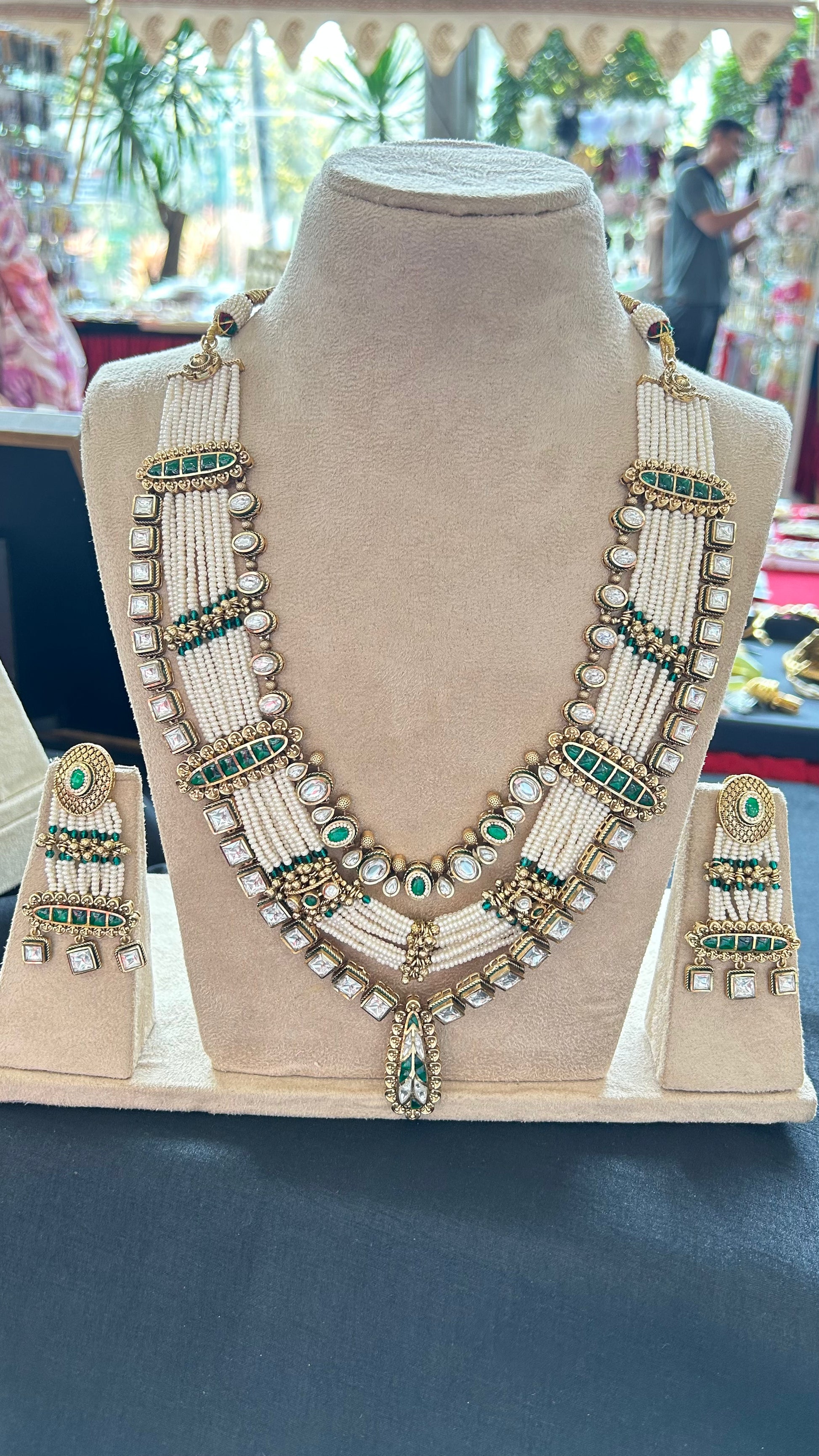 The Vasudha Emerald Kundan Necklace Set is a statement piece that beautifully blends traditional craftsmanship with regal elegance. Designed with multiple strands of delicate pearls, the necklace is adorned with intricate Kundan settings and rich emerald-toned accents that create a striking layered look.