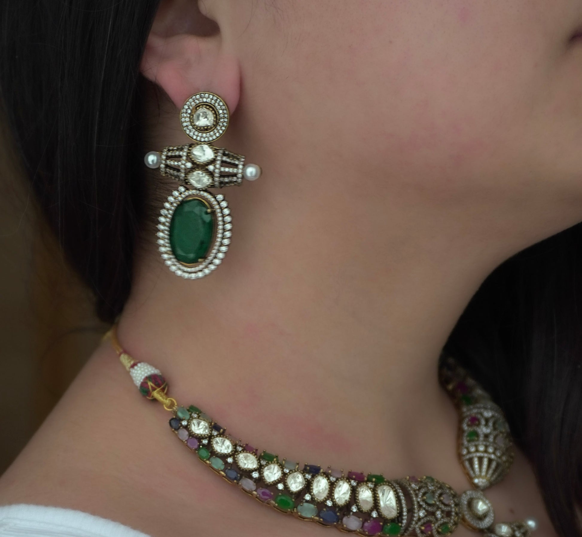 Victorian Navratna Hasli Navratna Necklace Set (Necklace & Earrings)